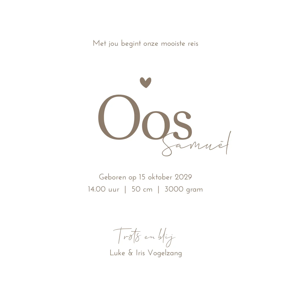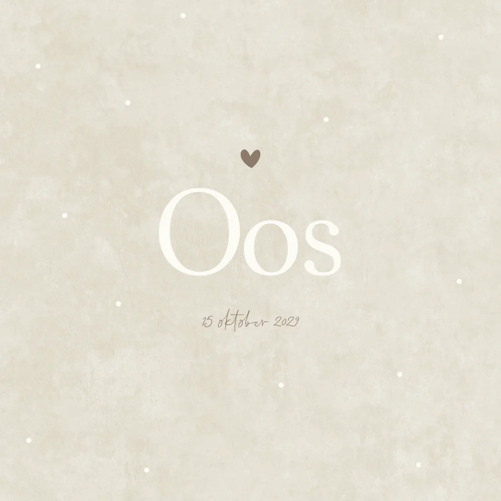 Een stoer, tijdloos en neutraal beige kleurig gestipt geboortekaartje Oos. De achtergrond bevat een beige velvetlook/ suede kleur wat het kaartje heel zacht maakt. De letters kunnen staan in wit maar kunnen ook met folie wat het kaartje extra speciaal maakt. Je past het kaartje eenvoudig en snel aan, in onze online editor.
