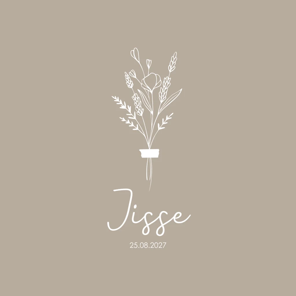 Een taupe kleurig geboortekaartje met een lief geïllustreerd bosje bloemen/droogbloemen. Wil je de kaart aanpassen in bijvoorbeeld de kleur van de babykamer? Geen probleem, je past de licht bruine kleur van kaartje Jisse eenvoudig aan in de editor.