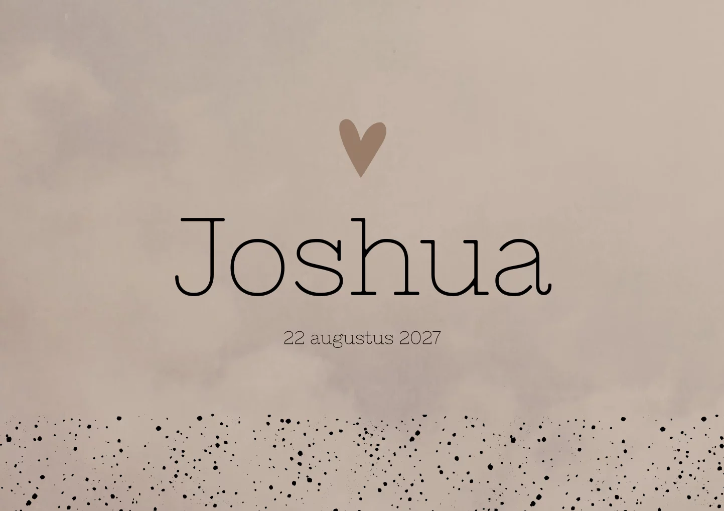 Een taupe bruin gewolkt geboortekaartje met stipjes, hartjes en zwarte letters. Kaartje Joshua is stoer en neutraal. Wil je graag iets aanpassen? Neem dan een kijkje in onze editor voor alle opties.
