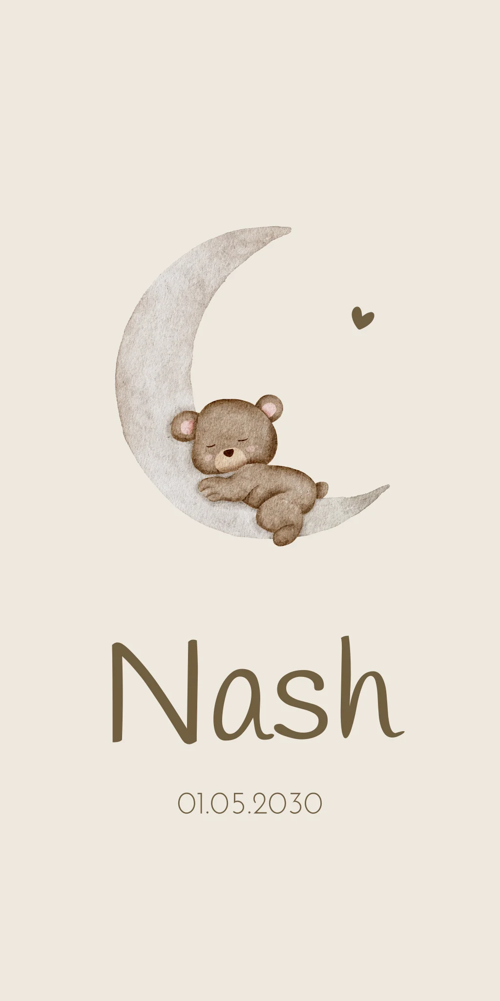 Hip en stijlvol geboortekaartje met een teddybeer in waterverf stijl die ligt de slapen op een maantje. De kaart Nash is in een naturel beige tint, dit is allemaal aanpasbaar in onze online editor.