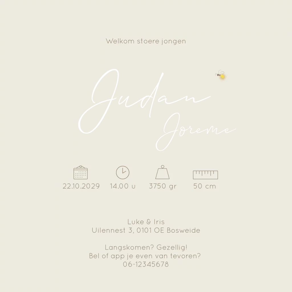 Een beige/ crème geboortekaartje in naturel tinten met een silhouet van een jongetje bij een tent. Het jongetje op kaartje Judan wijst naar een vuurvliegje. Op de achtergrond zie je bergen en een maan met sterren. Wil je graag iets aanpassen aan het kaartje? Neem dan een kijkje in onze editor voor de vele opties! Dit is een leuk ontwerp voor mensen die van kamperen als vakantie houden of er graag op uit trekken d.m.v. backpacken. Voor de ergste avonturiers en wereldreizigers.