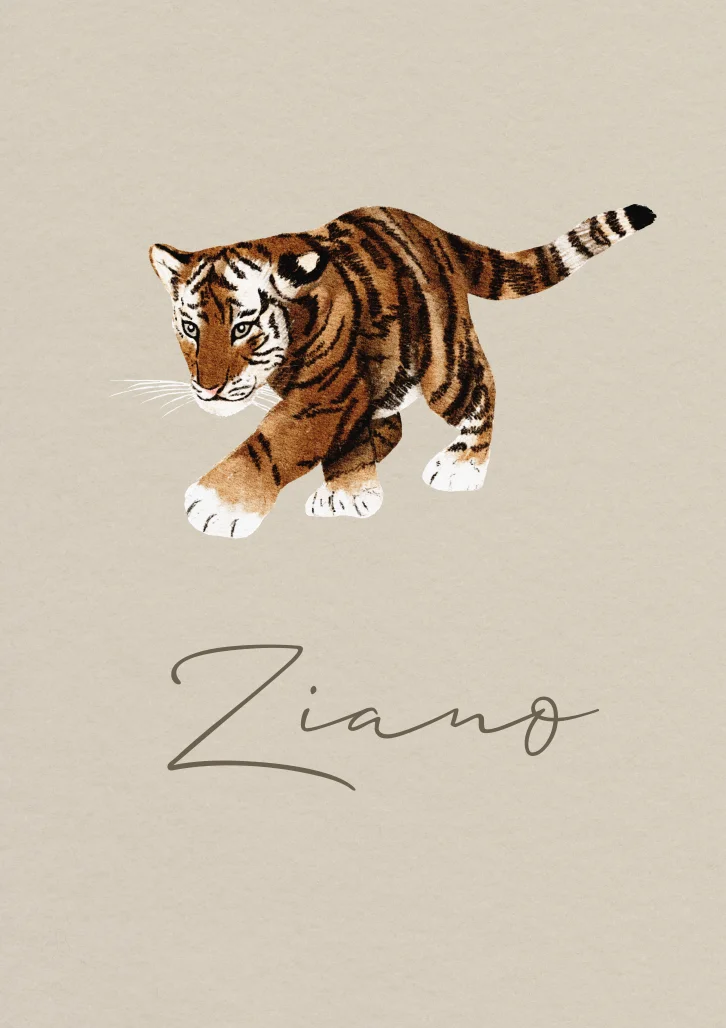 Een minimalistisch geboortekaartje met een illustratie van een tijger. De tekening op kaartje Ziano is in watercolor/waterverf stijl getekend. Je past de kaart eenvoudig aan naar je eigen wensen.
