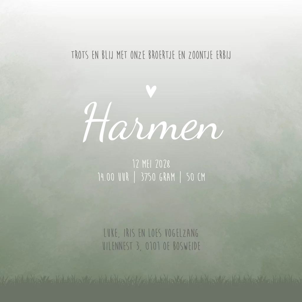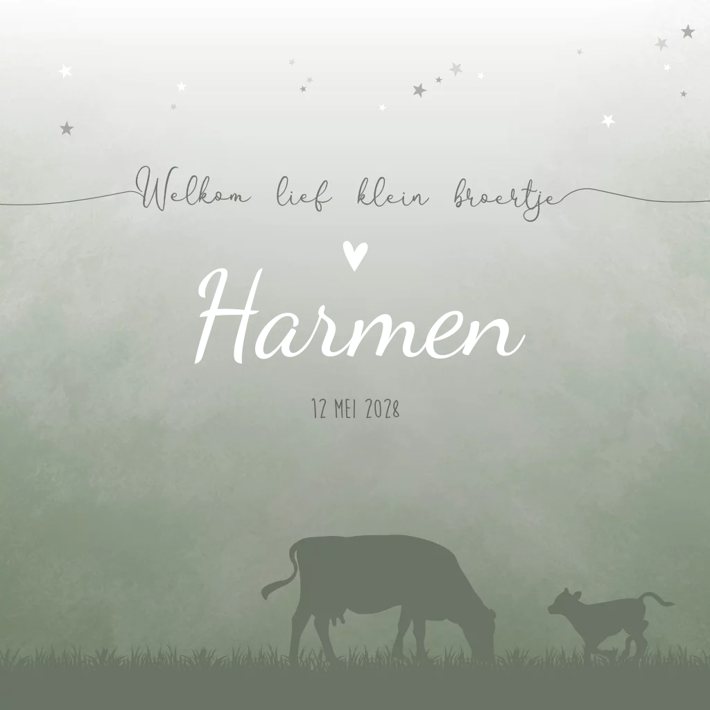 Een Oud groen gevlekt geboortekaartje met een illustratie van een koe en een kalfje op de voorzijde. Op de kaart zijn ook de boerderij hond, grote zus op de trekker/ tractor met haar kleine broertje in een bakje er achter. Wil je graag kaartje Harmen aanpassen naar jouw gezinssituatie? Pas dan gemakkelijk de kaart aan in onze editor.