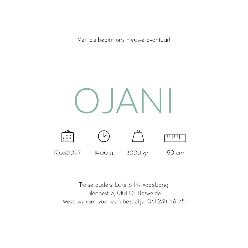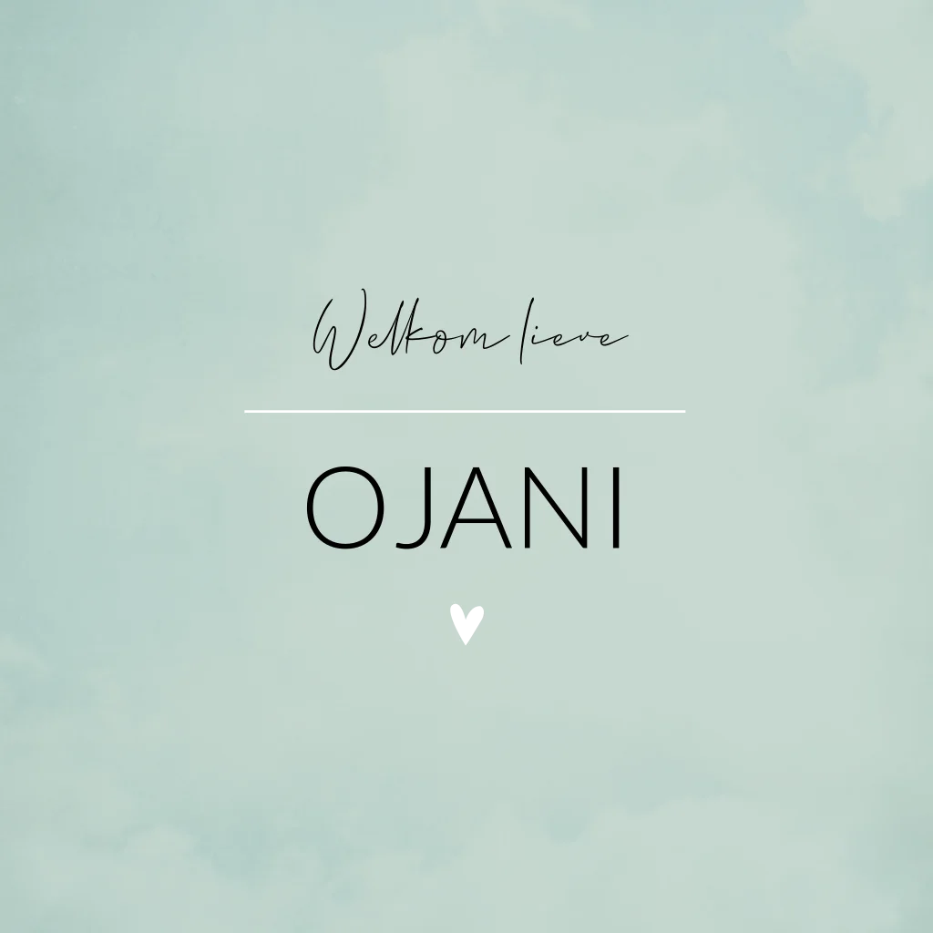 Turkoois, groen/ blauw gewolkt geboortekaartje met gouden hartjes. Dit ontwerp met de naam Ojani geeft een zomerse uitstraling door de zee tinten en het gewolkte effect op de kaart. Wil je liever de kleuren en lettertypes aanpassen? Of wil je iets toevoegen of weghalen? Het is allemaal mogelijk in onze editor!
