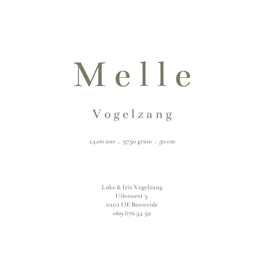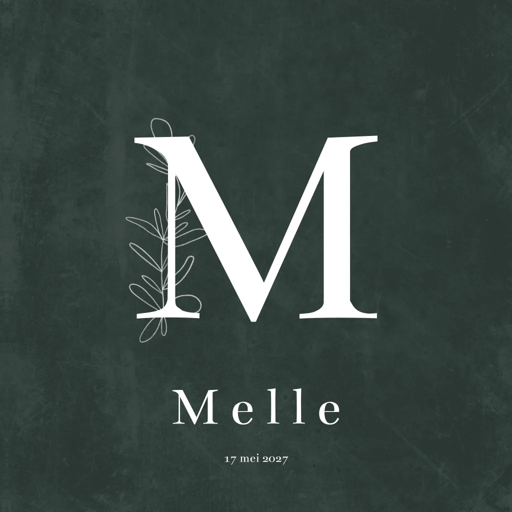 Een geboortekaartje met groene stoere achtergrond en een witte letters. Het kaartje Melle heeft leuke blaadjes als detail. Wil je het kaartje graag aanpassen? Neem dan een kijkje in onze editor voor de verschillende mogelijkheden! Mis je nog iets? Neem dan contact met ons op, dan helpen we je graag verder.