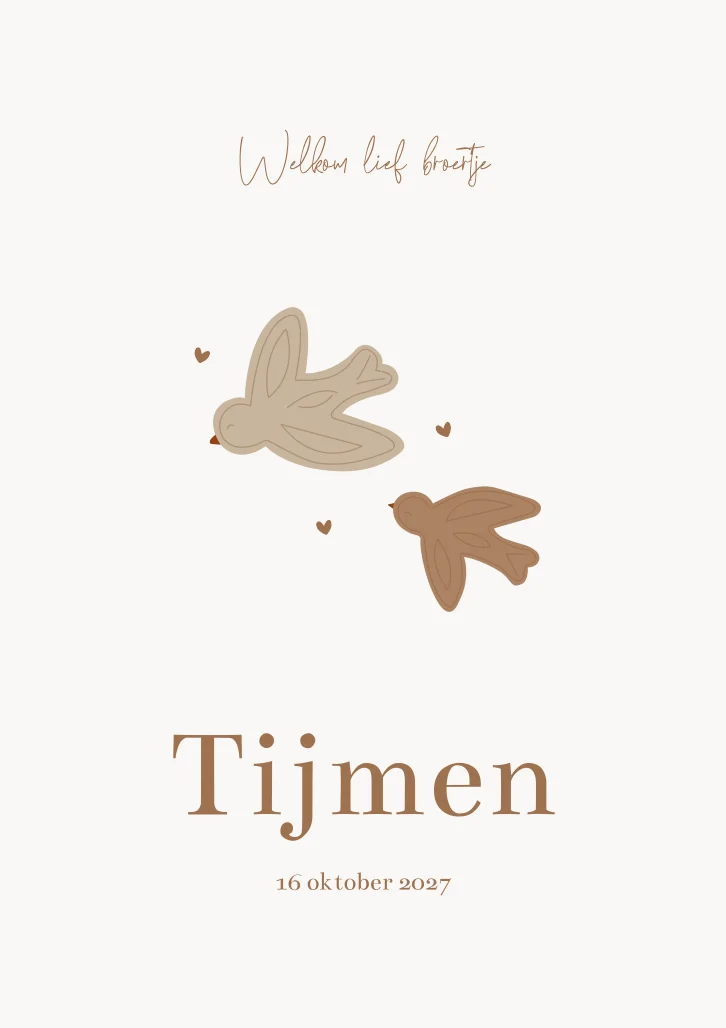 Een neutraal geboortekaartje met verschillende beige en bruine tinten. Perfect voor de herfst. Op kaartje Tijmen staat een illustratie van twee vogels/spreeuwen/zwaluwen die bij elkaar vliegen en worden omringd door kleine hartjes. Wil je kaartje Tijmen graag aanpassen? Neem dan een kijkje in onze editor voor de vele opties.