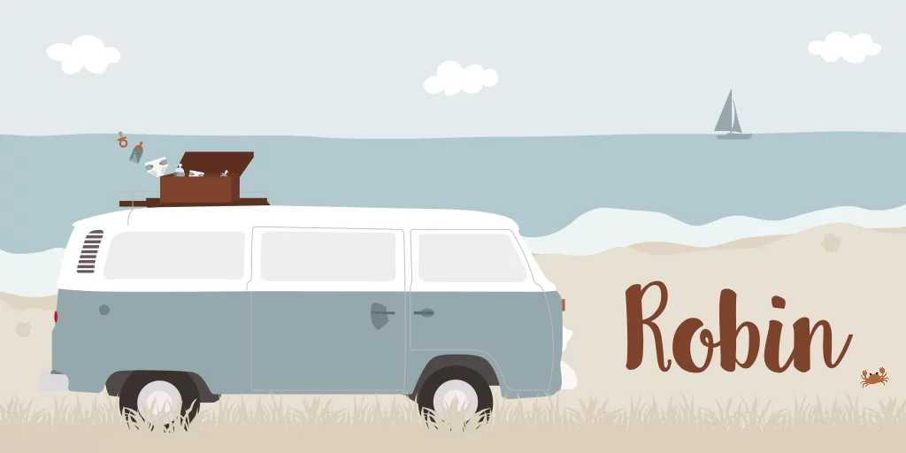 Een vrolijk geboortekaartje met een zomerse touch! Kaartje Robin is een kaartje met een retro Volkswagenbusje bij de zee. Op de kaart zie je verder een bootje, een krab, schelpen en het strand.