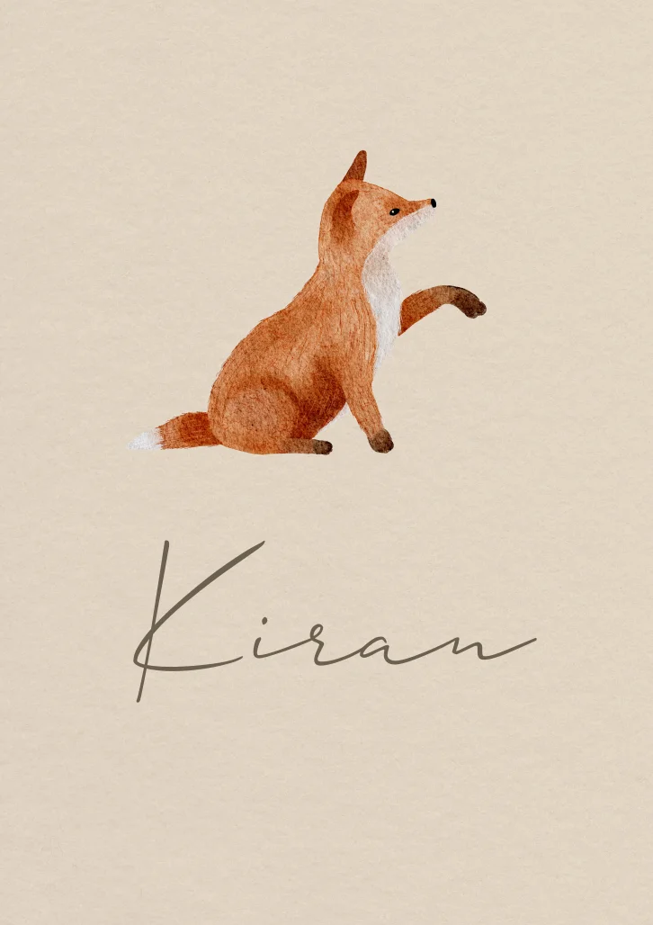 Een minimalistisch geboortekaartje met een illustratie van een vosje. De tekening op kaartje Kiran is in watercolor/waterverf stijl getekend. Je past de kaart eenvoudig aan naar je eigen wensen.