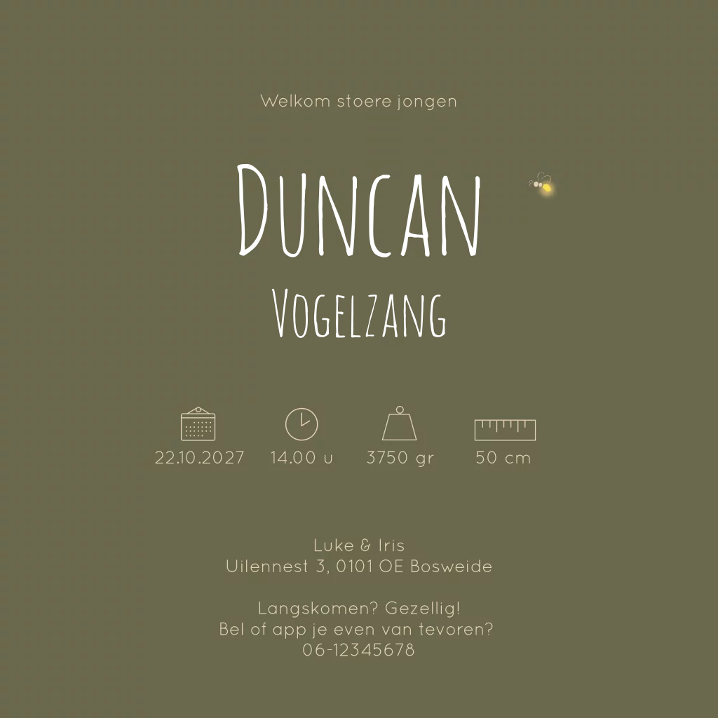 Een groen geboortekaartje met een silhouet van een jongetje bij een tent. Het jongetje op kaartje Duncan wijst naar een vuurvliegje. Op de achtergrond zie je bergen en een maan met sterren. Wil je graag iets aanpassen aan het kaartje? Neem dan een kijkje in onze editor voor de vele opties! Dit is een leuk ontwerp voor mensen die van kamperen als vakantie houden of er graag op uit trekken d.m.v. backpacken. Voor de ergste avonturiers en wereldreizigers.