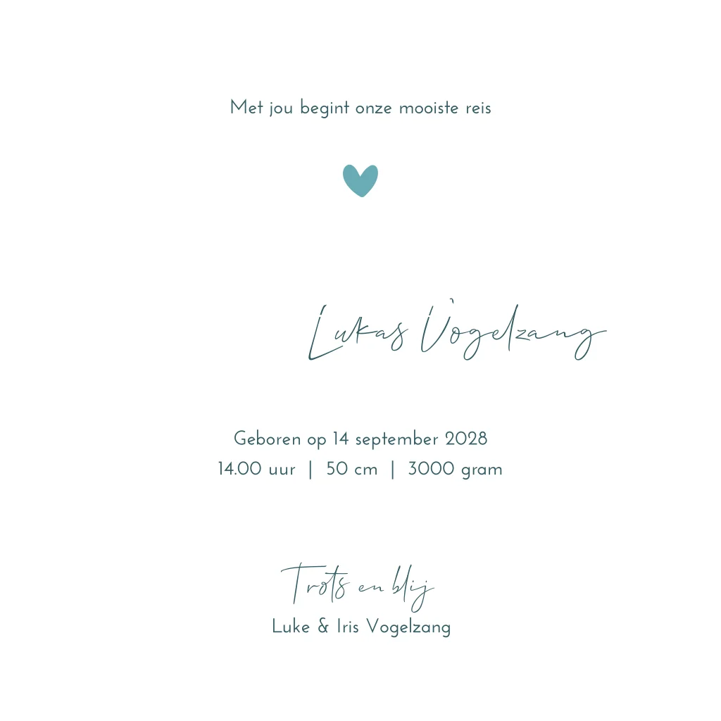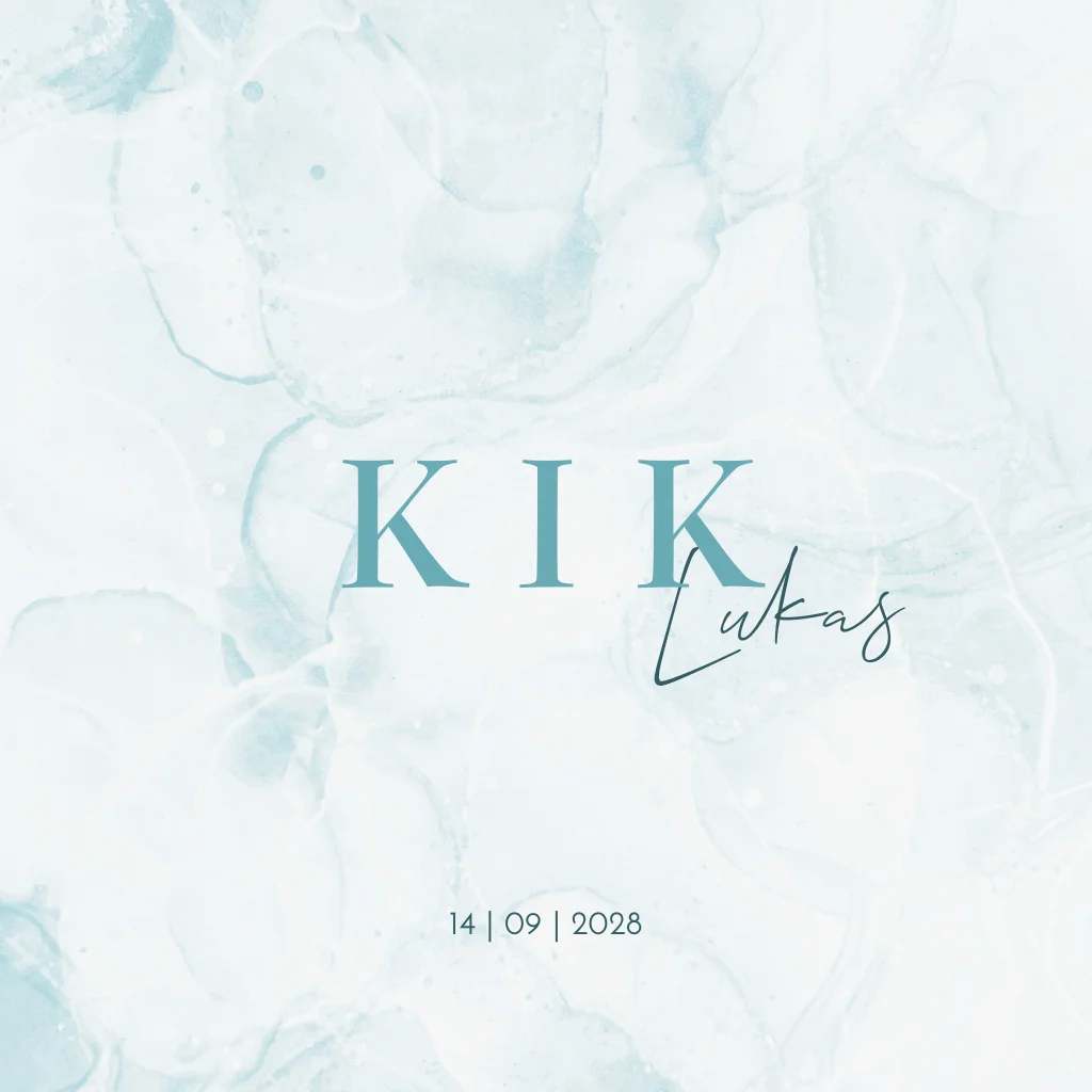 Een zacht lief en tijdloos licht blauw geboortekaartje Kik. De achtergrond bevat een lichte watercolor look wat het kaartje heel zacht maakt. De letters kun je ook in goudfolie zetten, wat het kaartje extra speciaal maakt. Je past het kaartje eenvoudig en snel aan, in onze online editor.