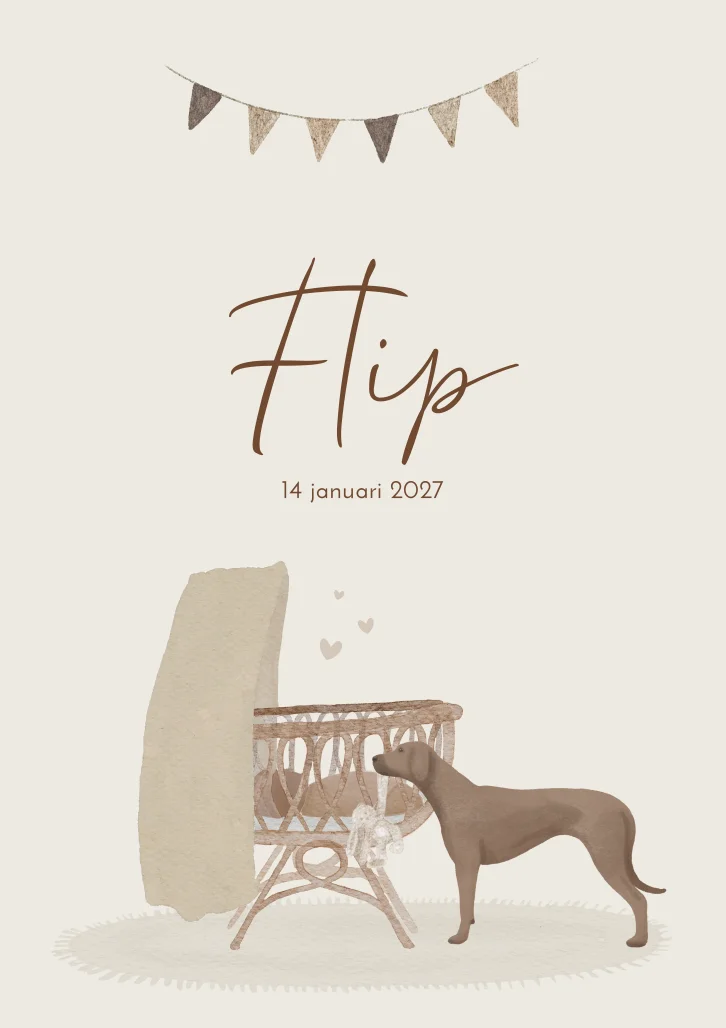 Een lief beige geboortekaartje Flip, geïllustreerd in waterverf stijl. Het baby'tje in de wieg heeft een bruine huidskleur. Op het kaartje staat een vizsla/weimaraner hond die een knuffel aan zijn nieuwe huisgenoot geeft. Ziet jouw huisdier, kindje of wieg er anders uit? In onze beeldbank vind je een groot aanbod aan verschillende illustraties. Staat jouw gewenste illustratie er niet tussen? Informeer naar de mogelijkheden voor een illustratie op maat!