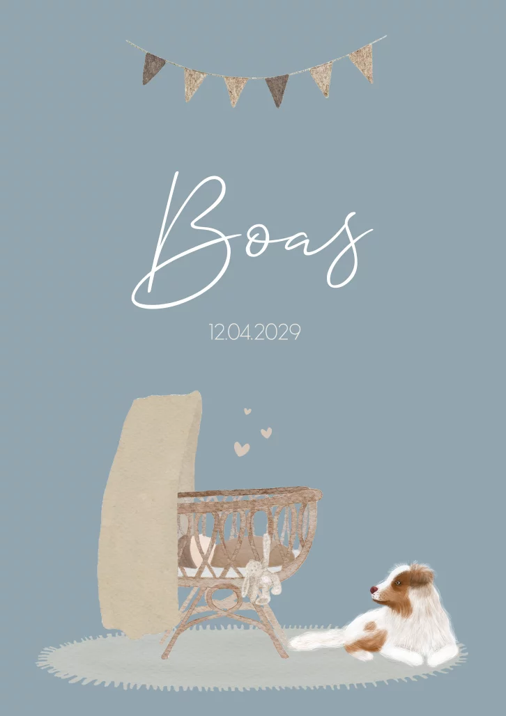 Een oud blauw geboortekaartje Boas, geïllustreerd in waterverf stijl. Het baby'tje in de wieg heeft een bruine huidskleur. Op het kaartje staat een Australische herdershond die voor het wiegje van zijn nieuwe huisgenoot ligt te waken. Ziet jouw huisdier, kindje of wieg er anders uit? In onze beeldbank vind je een groot aanbod aan verschillende illustraties. Staat jouw gewenste illustratie er niet tussen? Informeer naar de mogelijkheden voor een illustratie op maat!