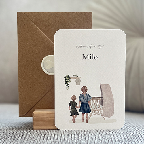 Een waterverf geboortekaartje met twee zusjes die bij het wiegje gaan kijken. Kaartje Bastiaan kan je helemaal zelf aanpassen. Neem gerust een kijkje in onze editor voor alle opties! Mis je nog iets? Neem dan gerust contact met ons op.