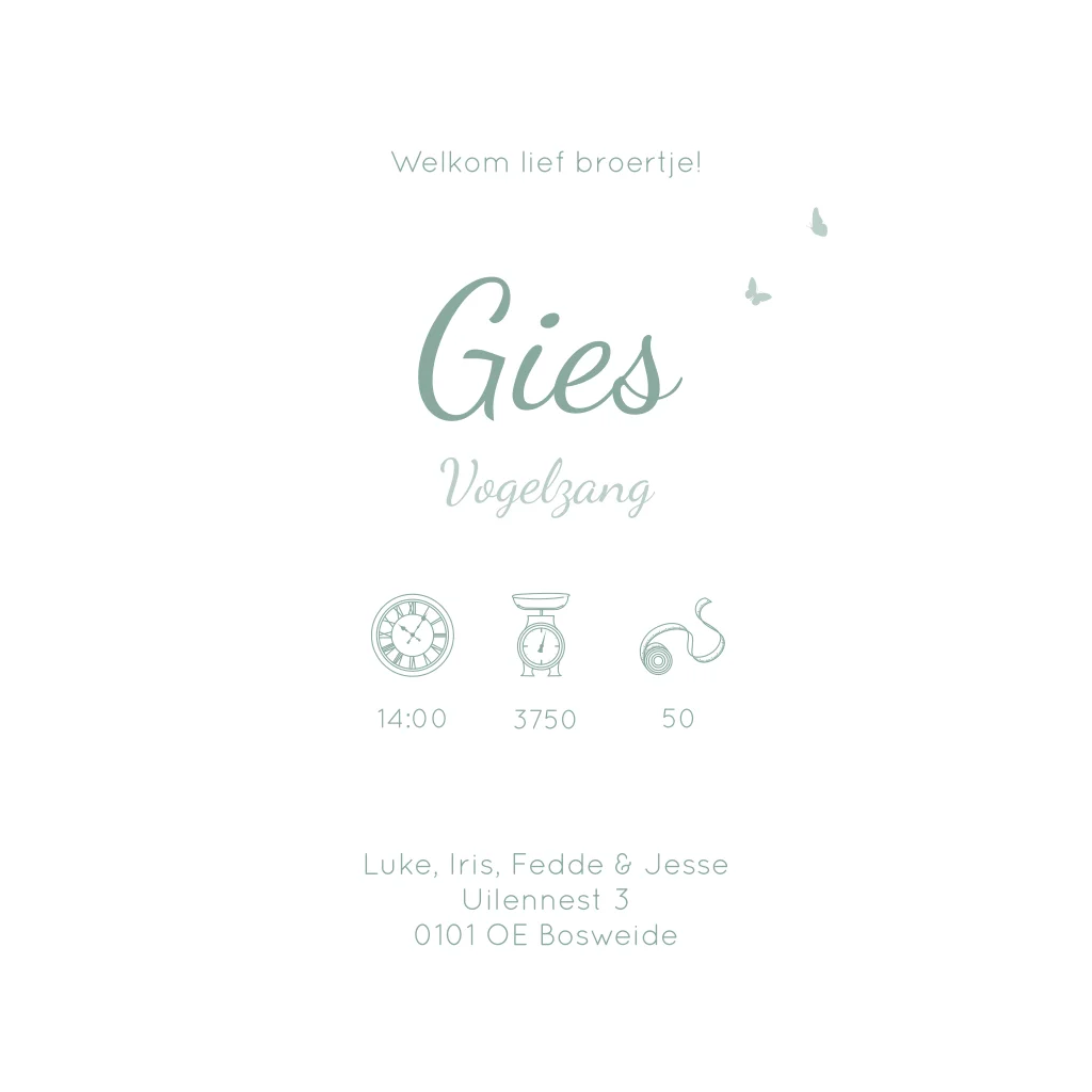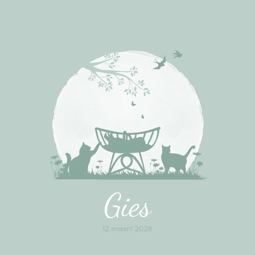 Een lief zacht groen geboortekaartje met een silhouet illustratie van een kat en een poes die in het wiegje kijken. Er vliegen vlinders en vogels bij de boom. En er staan bloemetjes bij het babybedje. Kaartje Gies kan je eenvoudig zelf aanpassen in onze editor!