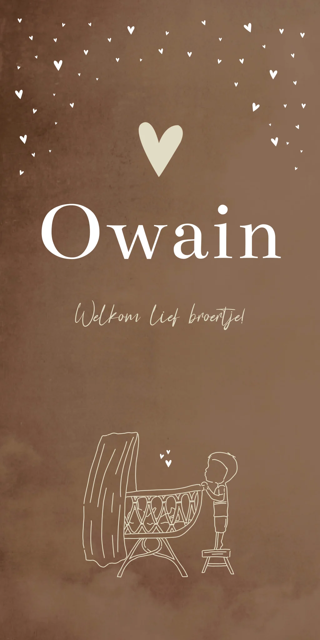 Een illustratief warm geboortekaartje in bruine tinten met witte hartjes en een beige kleur voor de lijntekening van het wiegje en het kindje wat op een krukje over het randje van de wieg kijkt.