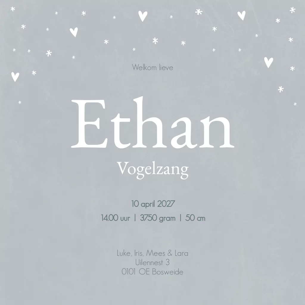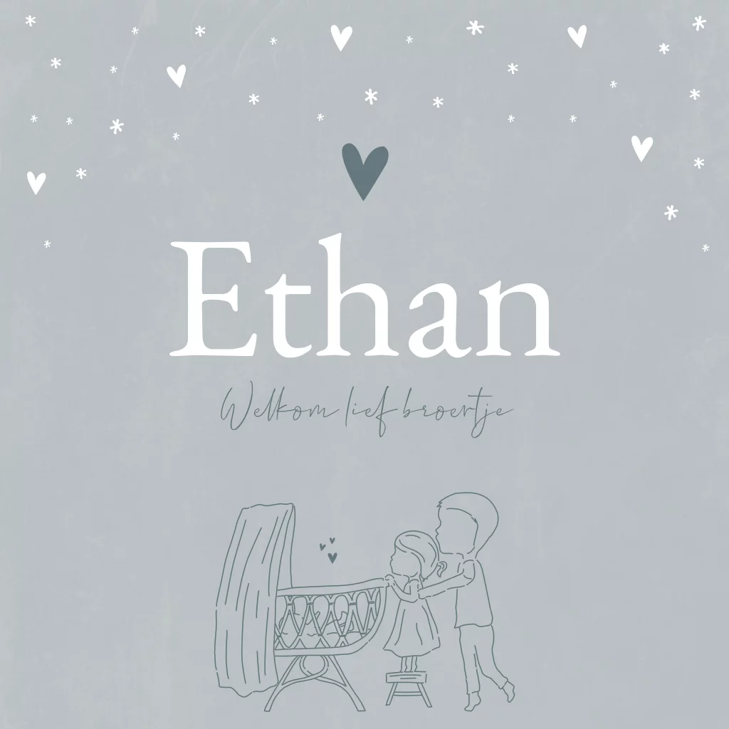 Een romantisch lief blauw geboortekaartje met een lijntekening van een grote broer en zus die in het wiegje kijken. Kaartje Ethan is een lief en klassiek kaartje. Wil je liever een andere illustratie? Neem dan een kijkje voor al onze opties in de editor!