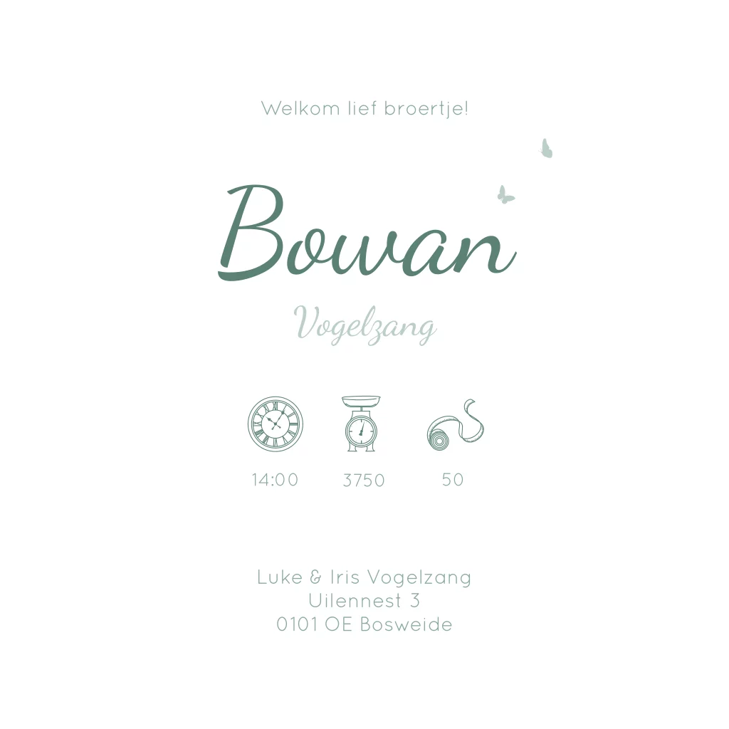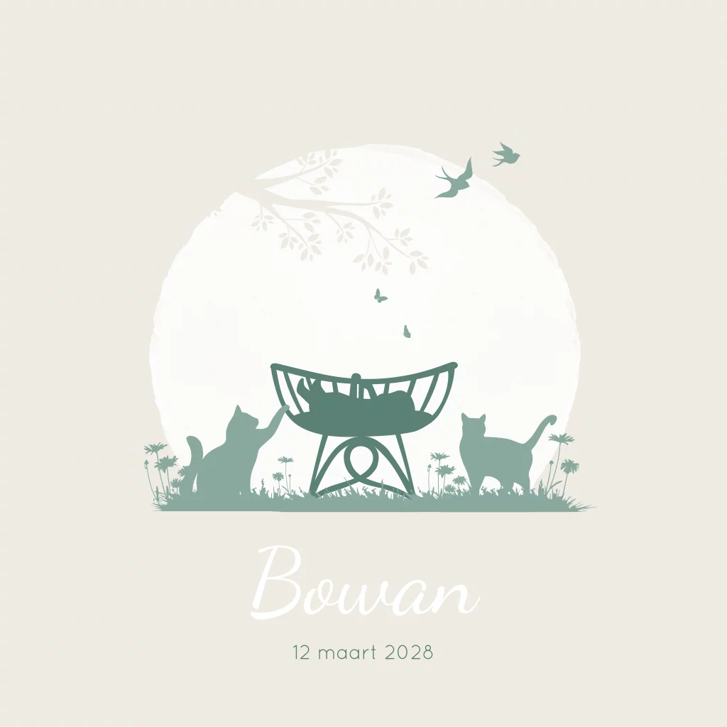 Een lief zacht beige babykaartje met een silhouet illustratie van een kat en een poes die in het wiegje kijken. De accent kleuren zijn zachte groene tinten. Er vliegen vlinders en vogels bij de boom. En er staan bloemetjes bij het babybedje. Kaartje Bowan kan je eenvoudig zelf aanpassen in onze editor!