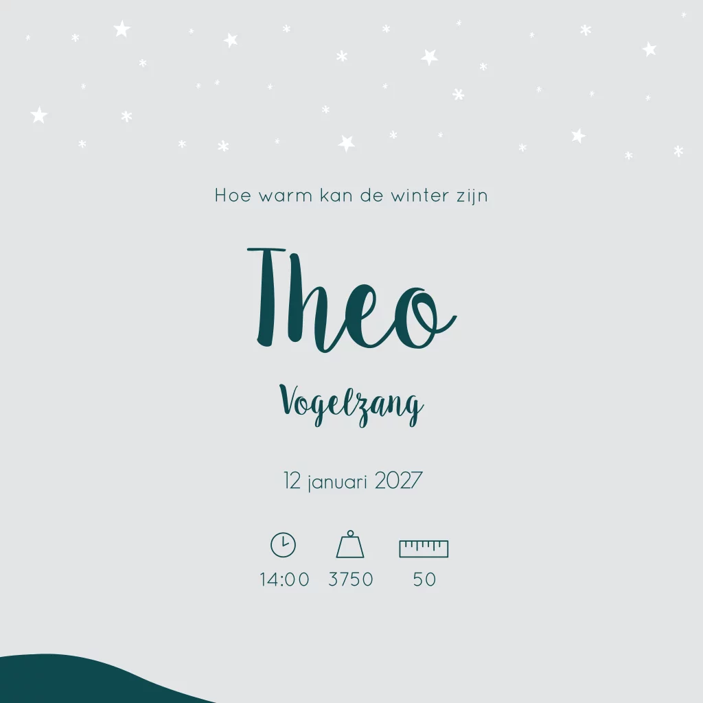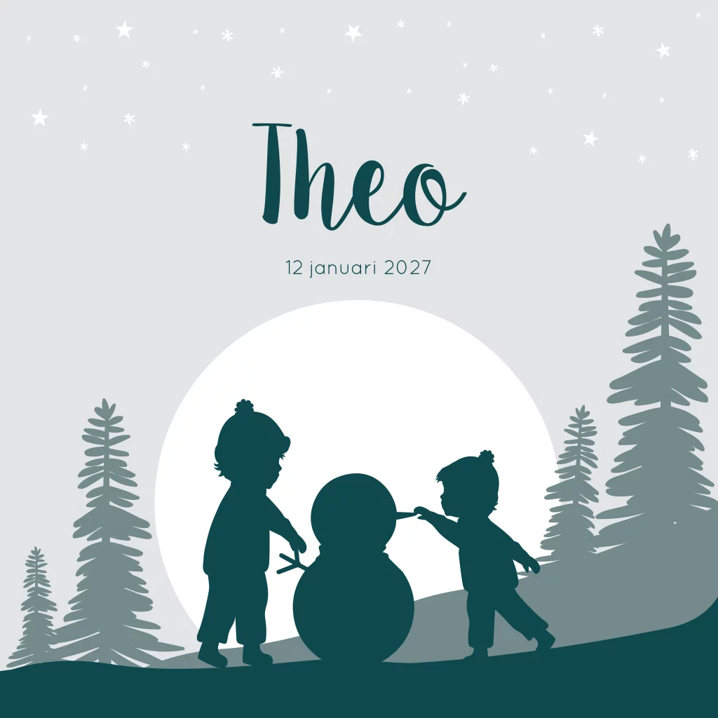 Een winters geboortekaartje met een grote broer met zijn broertje die samen een sneeuwpop maken. Ze worden omringd door het bos, de maan en sterren. Kaartje Theo is een mooi blauw kaartje die een winterse uitstraling heeft.