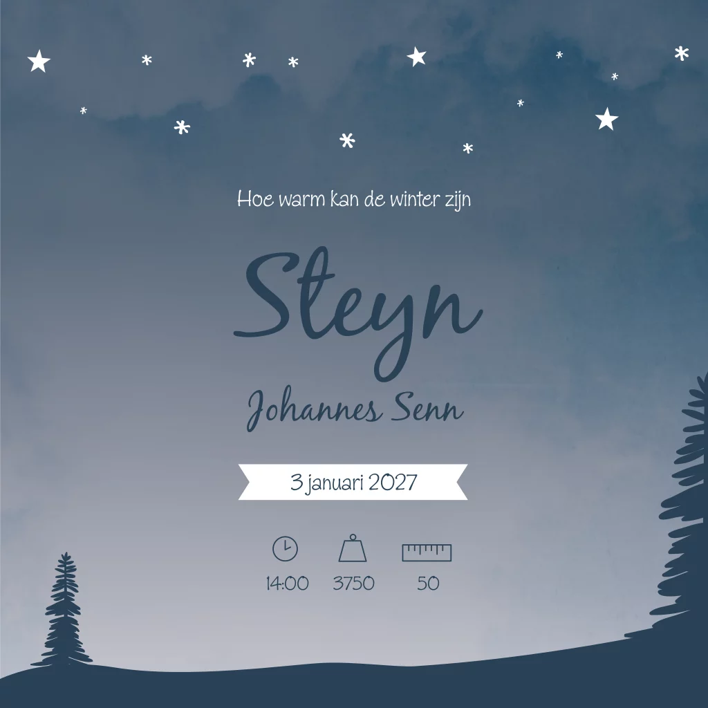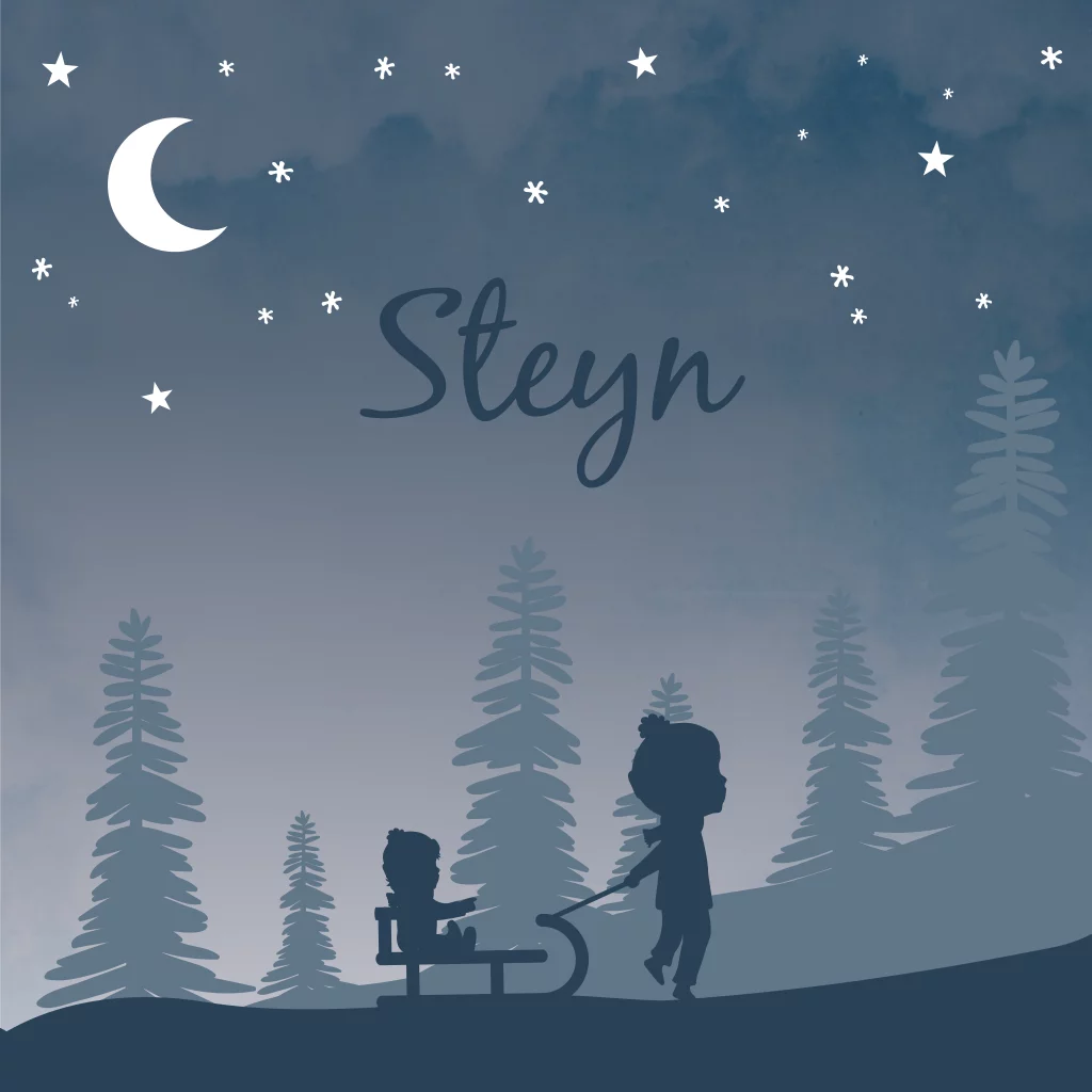 Een winter geboortekaartje met twee broertjes die met de slee op avontuur zijn in de sneeuw, omring door het bos, de maan en sterren. Kaartje Steyn is een mooi blauw kaartje die een winterse uitstraling heeft.
