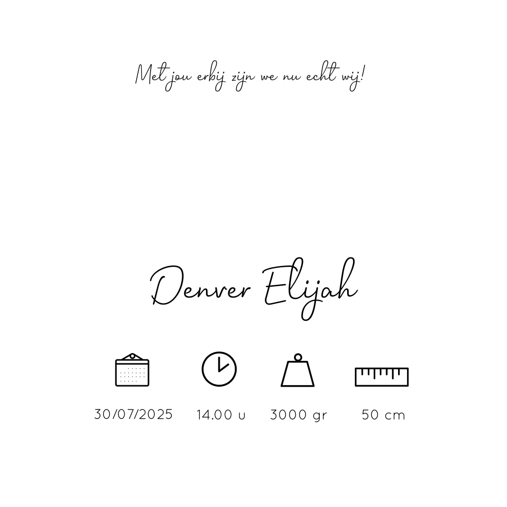 Strak en clean babykaartje met ruimte voor een foto boven de naam. De foto kun je op een los label laten drukken en met een paperclip aan de kaart klemmen. De naam kun je met goudfolie laten drukken voor een wauw-effect!