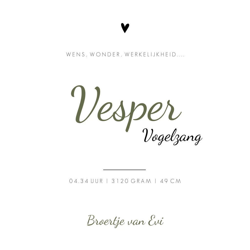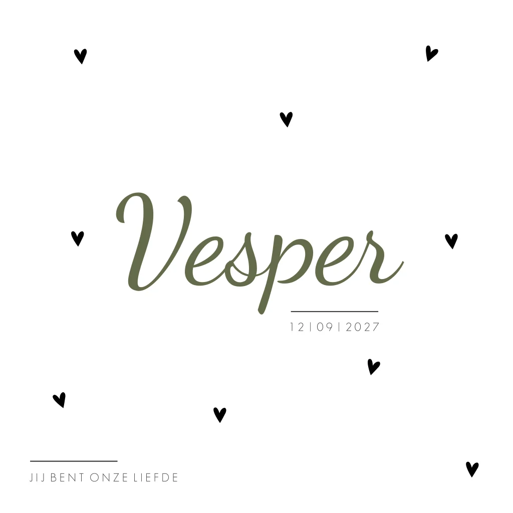 Een wit geboortekaartje met hartjes. De combinatie tussen de groene en zwarte kleur geeft kaartje Vesper een stoere uitstraling.