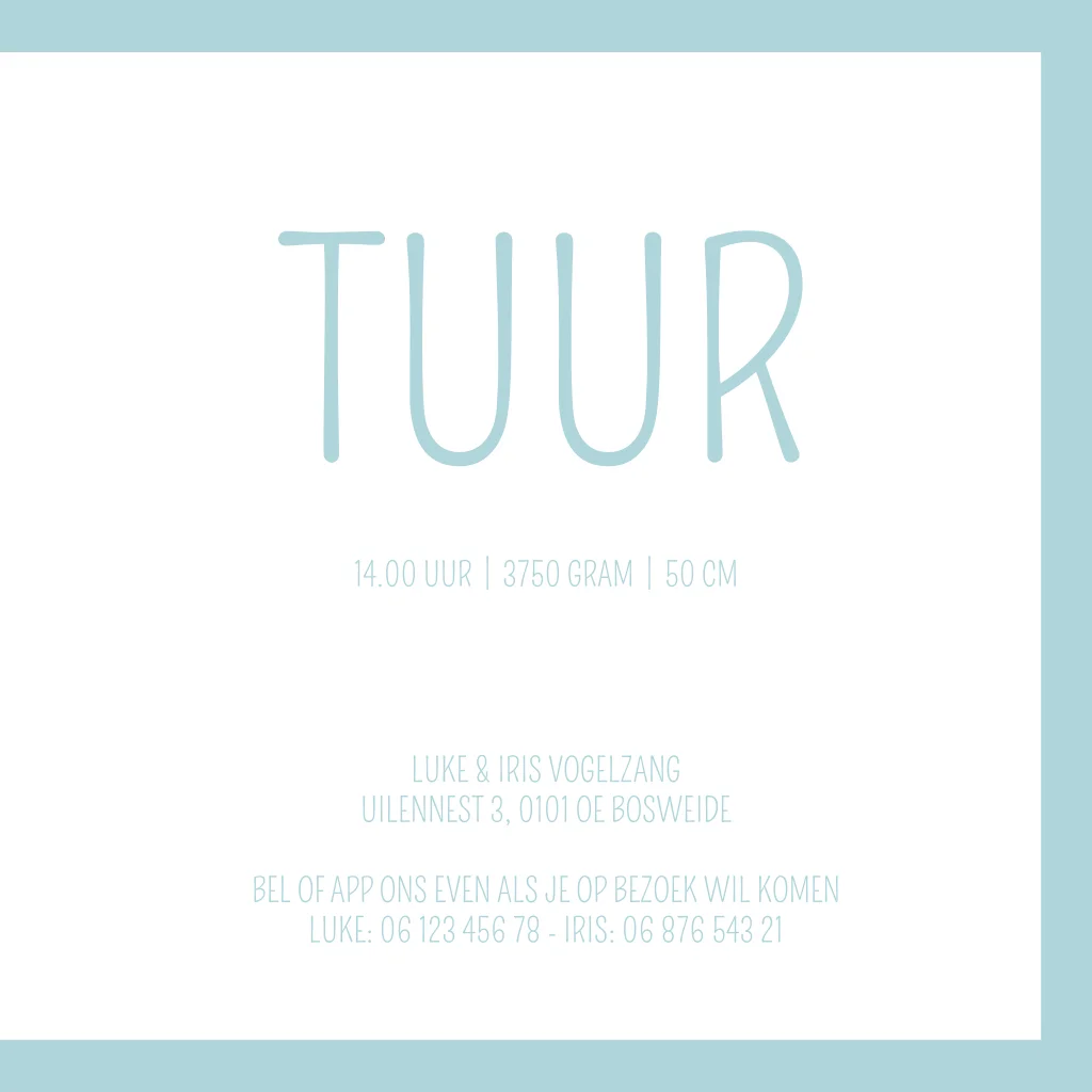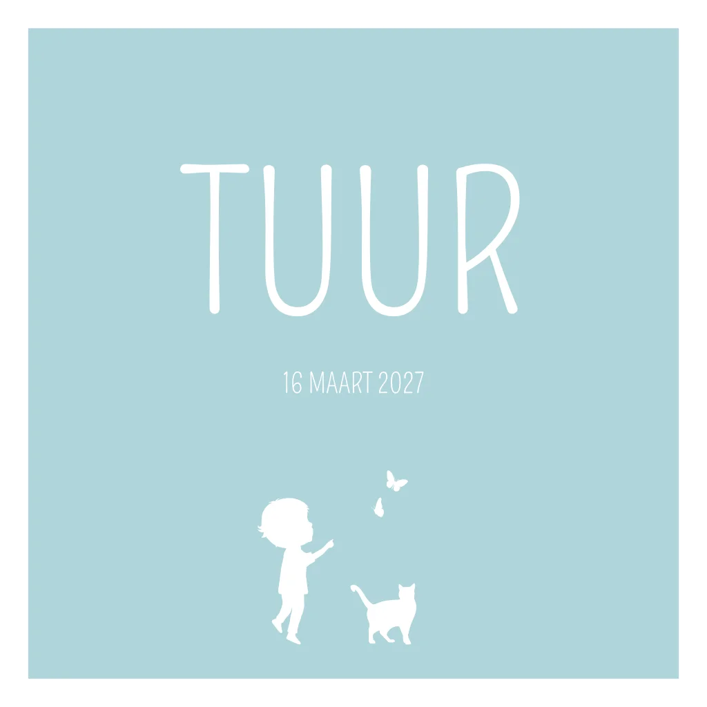 Zacht blauw geboortekaart met witte illustraties van een jongetje, kat en vlinders. Verander de kleur en/of opmaak van geboortekaartje Tuur eenvoudig in onze editor.
