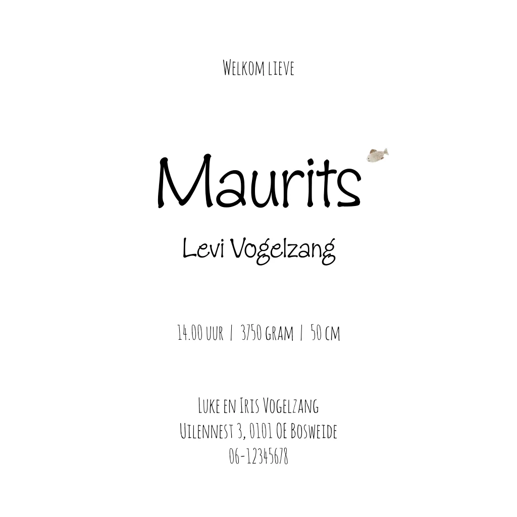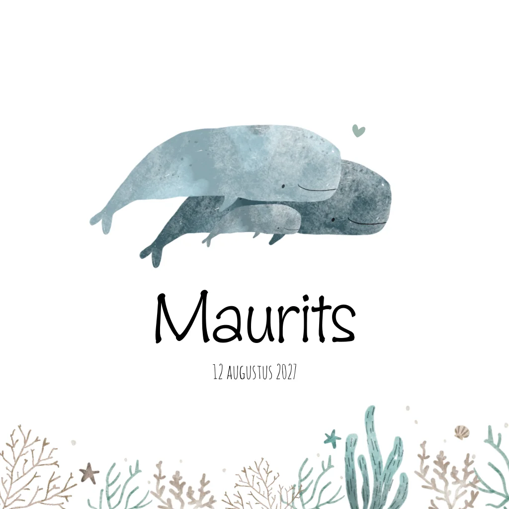Een wit geboortekaartje met een onderwaterwereld in waterverfstijl. Op de voorzijde van kaartje Maurits zijn drie walvissen te zien omringd door koraal, zeesterren en schelpjes. Een lief kaartje voor alle zee-liefhebbers.