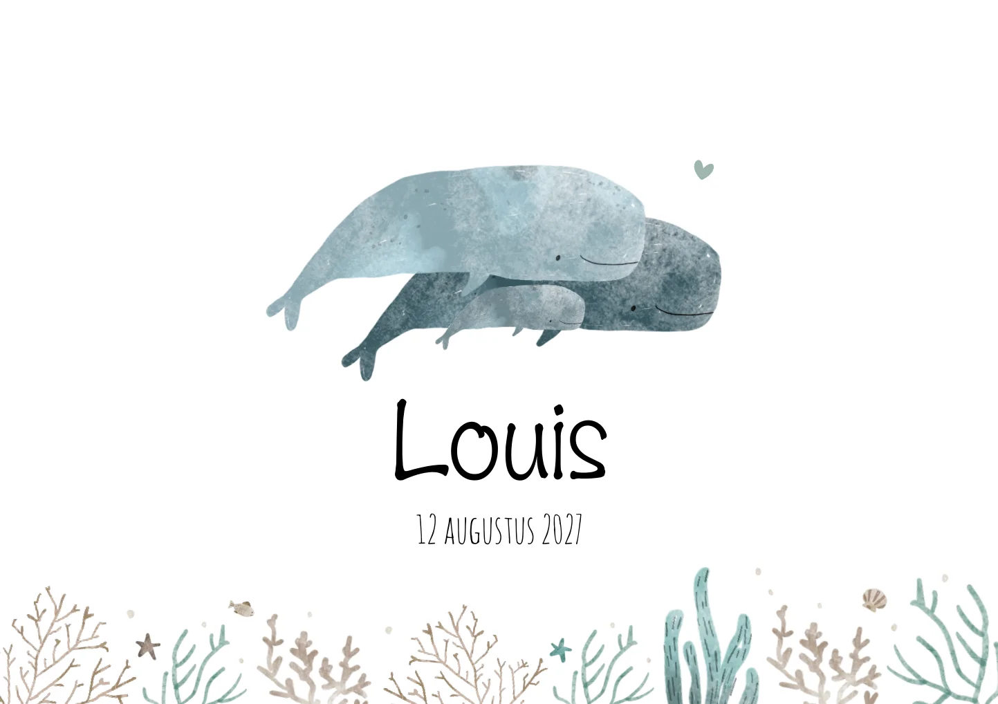 Een wit geboortekaartje met een onderwaterwereld in waterverfstijl. Op de voorzijde van kaartje Louis zijn drie walvissen te zien omringd door koraal, zeesterren en schelpjes. Een lief kaartje voor alle zee-liefhebbers.