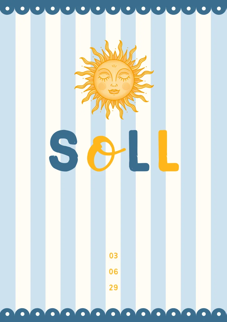 Een zonnig geboortekaartje met de naam Soll. De wit met blauwe strepen en de gele elementen maken het een heel vrolijk kaartje. Perfect om de geboorte van je kindje mee aan te kondigen. De kleuren pas je gemakkelijk aan in de editor.