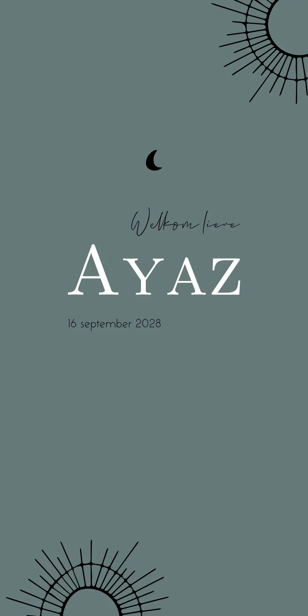 Een trendy geboortekaartje in donker grijs blauwe kleur met zwarte lijntekening van zonnetjes. Babykaartje Ayaz kun je eenvoudig aanpassen van kleur en/of opmaak.