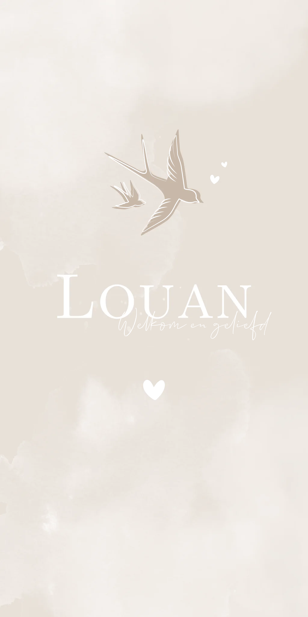 Een trendy geboortekaartje in beige/ creme naturel kleur met goudfolie lijntekening van zwaluw vogeltjes en kleine hartjes. De vogels vliegen in de wolken. Babykaartje Louan kun je eenvoudig aanpassen van kleur en/of opmaak.