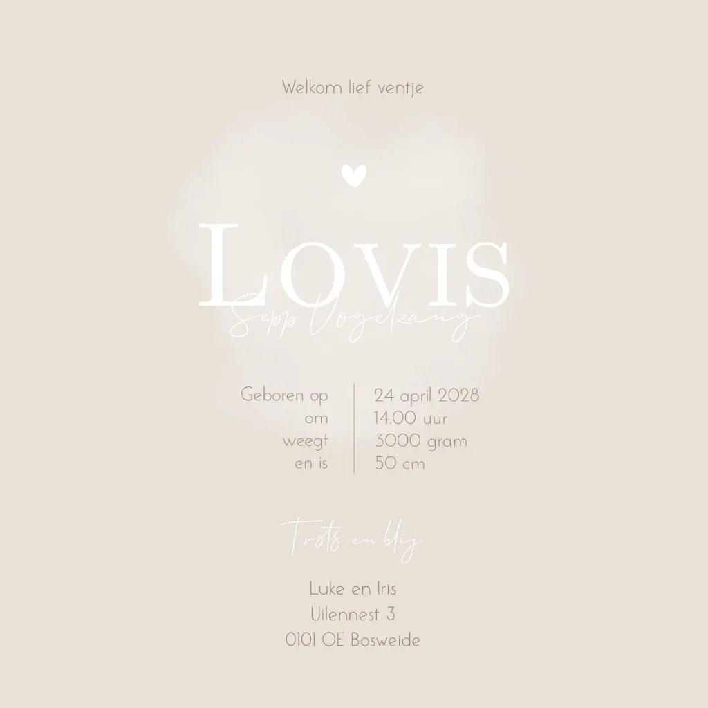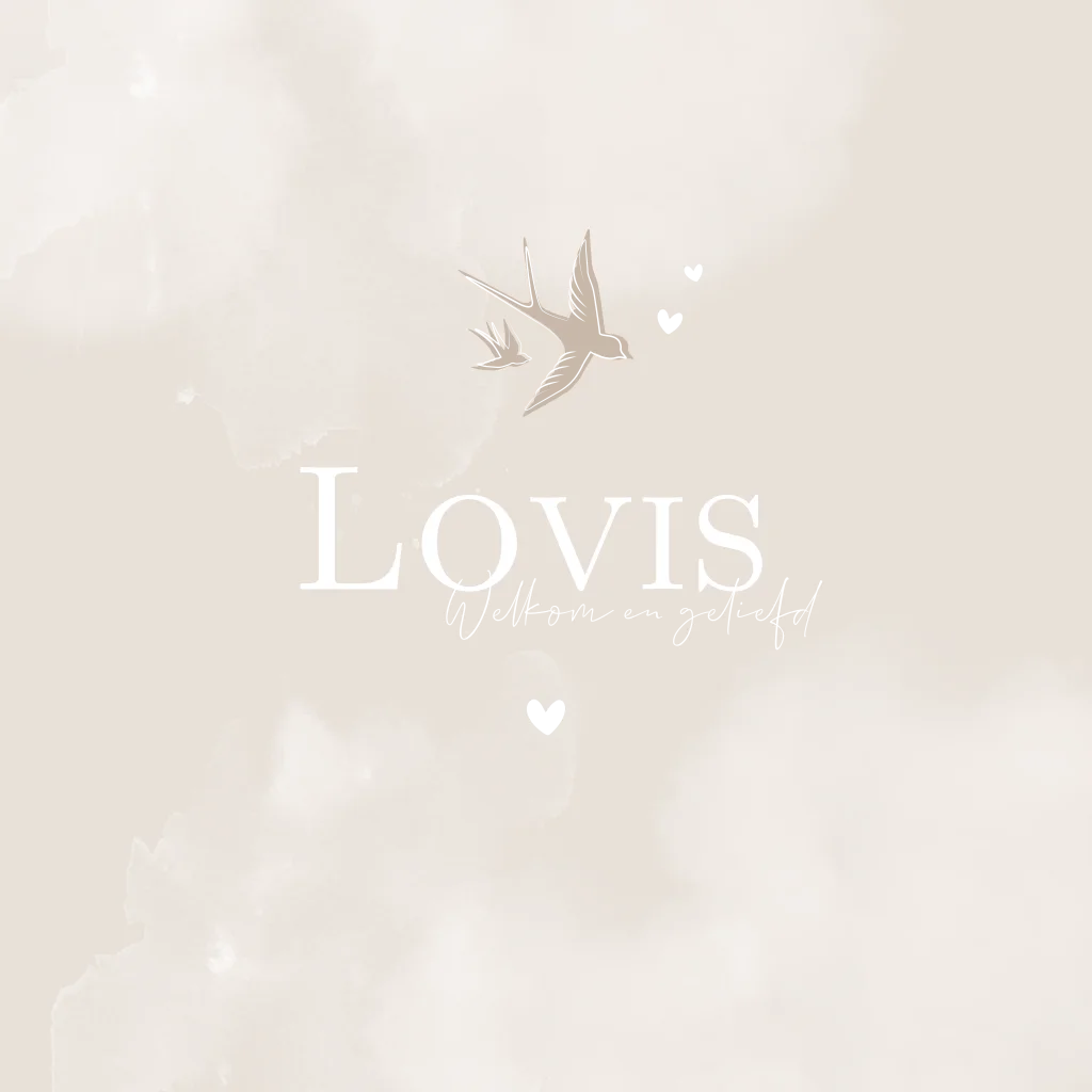 Een trendy geboortekaartje in beige/crème naturel kleur met goudfolie lijntekening van zwaluw vogeltjes en kleine hartjes. De vogels vliegen in de wolken. Babykaartje Lovis kun je eenvoudig aanpassen van kleur en/of opmaak.