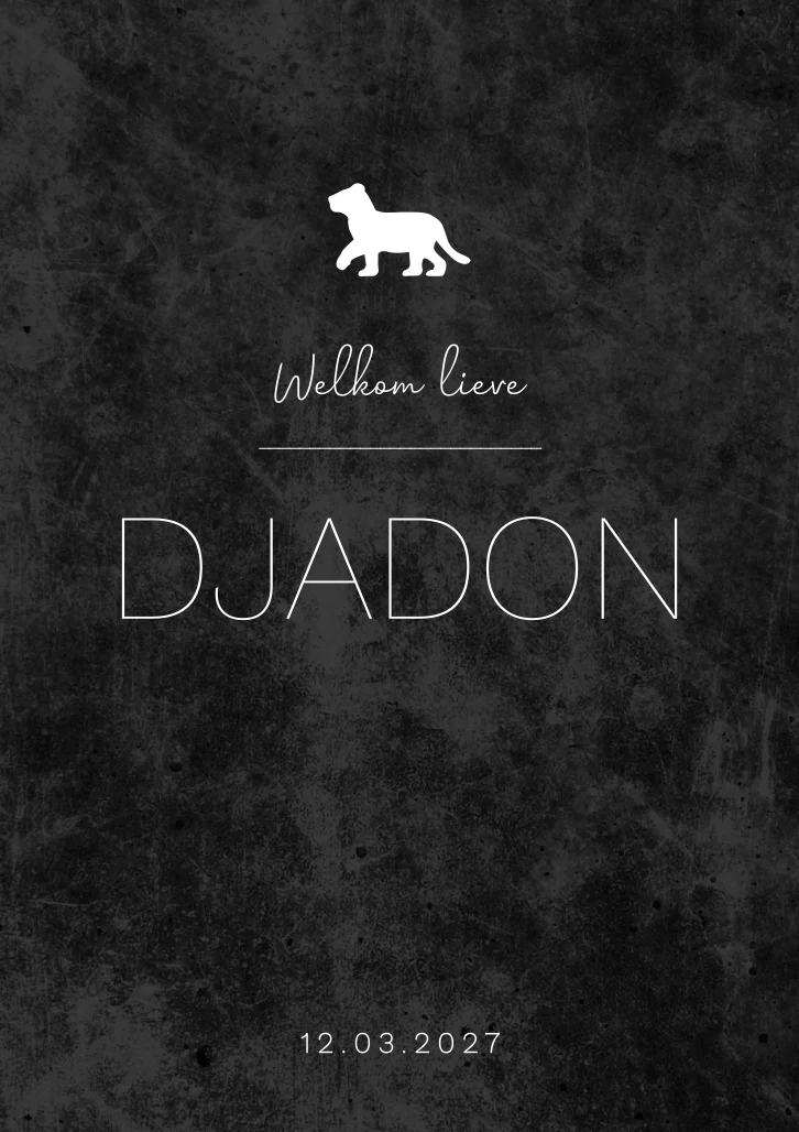 Super stoere babykaart Djadon in zwarte velvetlook, bedrukt met goudfolie voor een luxe uitstraling. Op de kaart zijn 2 spelende leeuwtjes afgebeeld, wat 2 broertjes/ zusjes kunnen afbeelden. Wil je de kaart qua kleuren afstemmen op de babykamer? Maak de kaart dan helemaal jouw eigen in onze editor!
