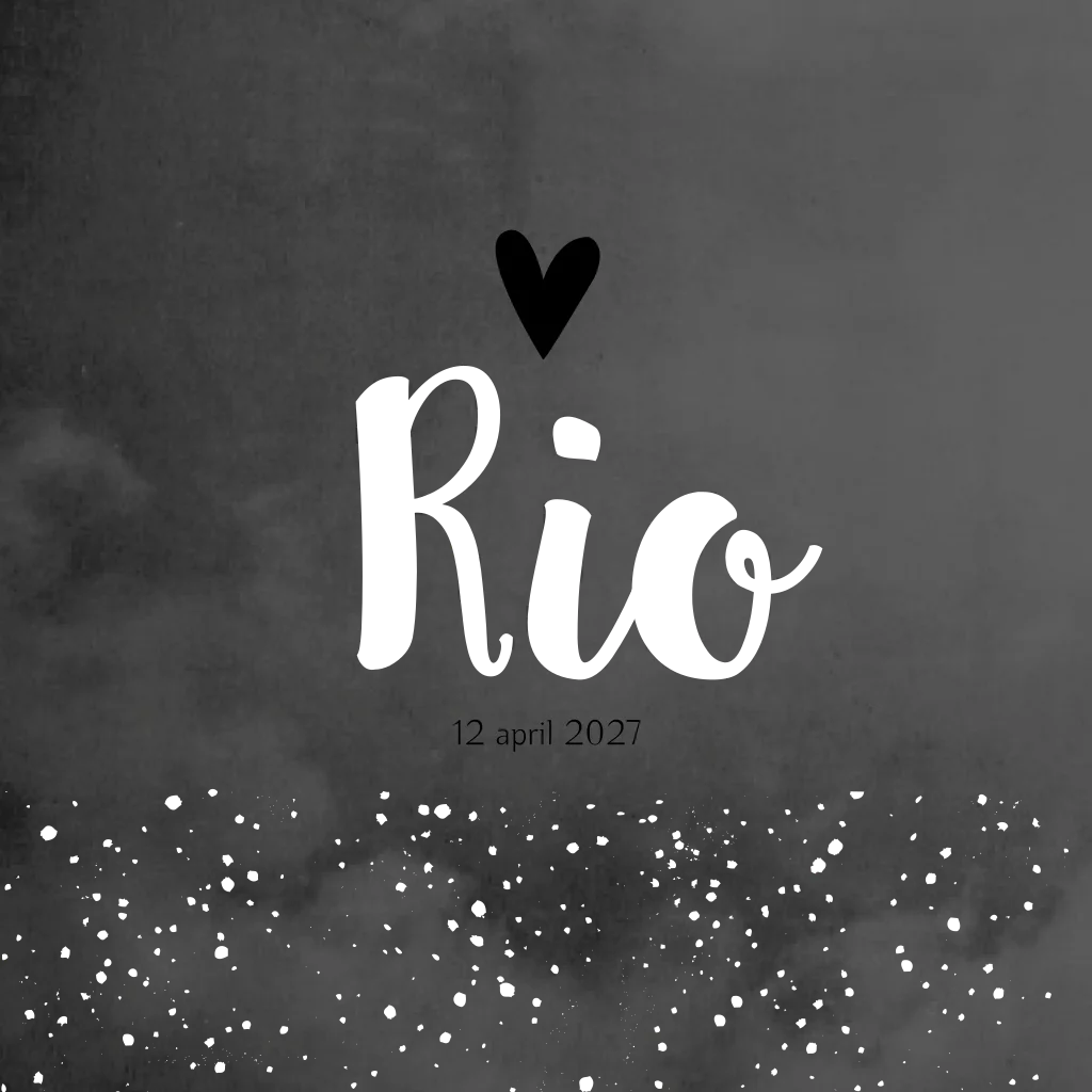 Stoer en donker baby kaartje met zwarte wolkjes en koperen stippen en zwarte hartjes. Geboortekaartje Rio is ontzettend mooi wanneer je het laat bedrukken met koperfolie. Liever een ander lettertype? Je past het kaartje eenvoudig aan in de editor.