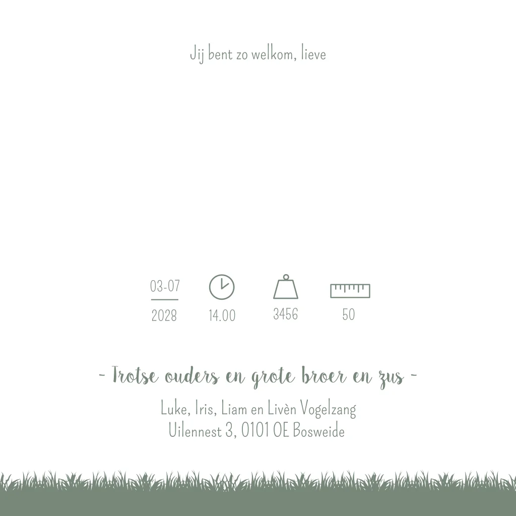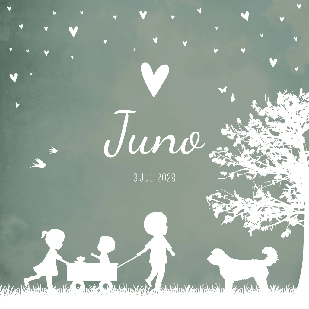 Een oud groen/ early dew geboortekaartje met een grote broer die een kar trek waar zijn kleine broertje in zit.De grote zus duwt de kar. Onder de boom staat een hondje, de Labradoodle staat erbij te kijken. Op de achterzijde zitten alle kinderen op de bakfiets/ fiets. Geboortekaartje Juno is een illustratie kaartje waarbij je de illustraties eenvoudig zelf kunt aanpassen in de editor. Zo kan je bijvoorbeeld extra dieren toevoegen of de hond vervangen voor een ander dier. Kom je er zelf niet uit? Neem gerust contact met ons op, we helpen je graag.