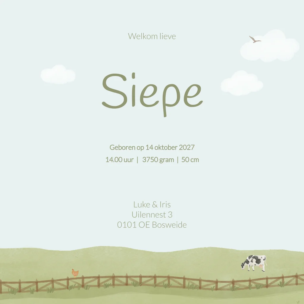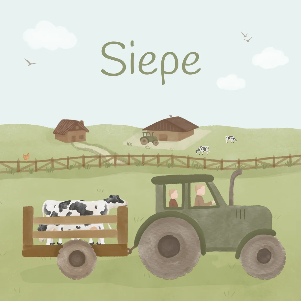 Verwacht jij een klein boertje of boerinnetje? Dan is kaartje Siepe iets voor jou! Op deze kaart is namelijk een boerderij te zien met koeien en een trekker. Heb je andere dieren op je boerderij lopen? In onze beeldbank vind je nog veel meer leuke dieren zoals schapen en kippen.