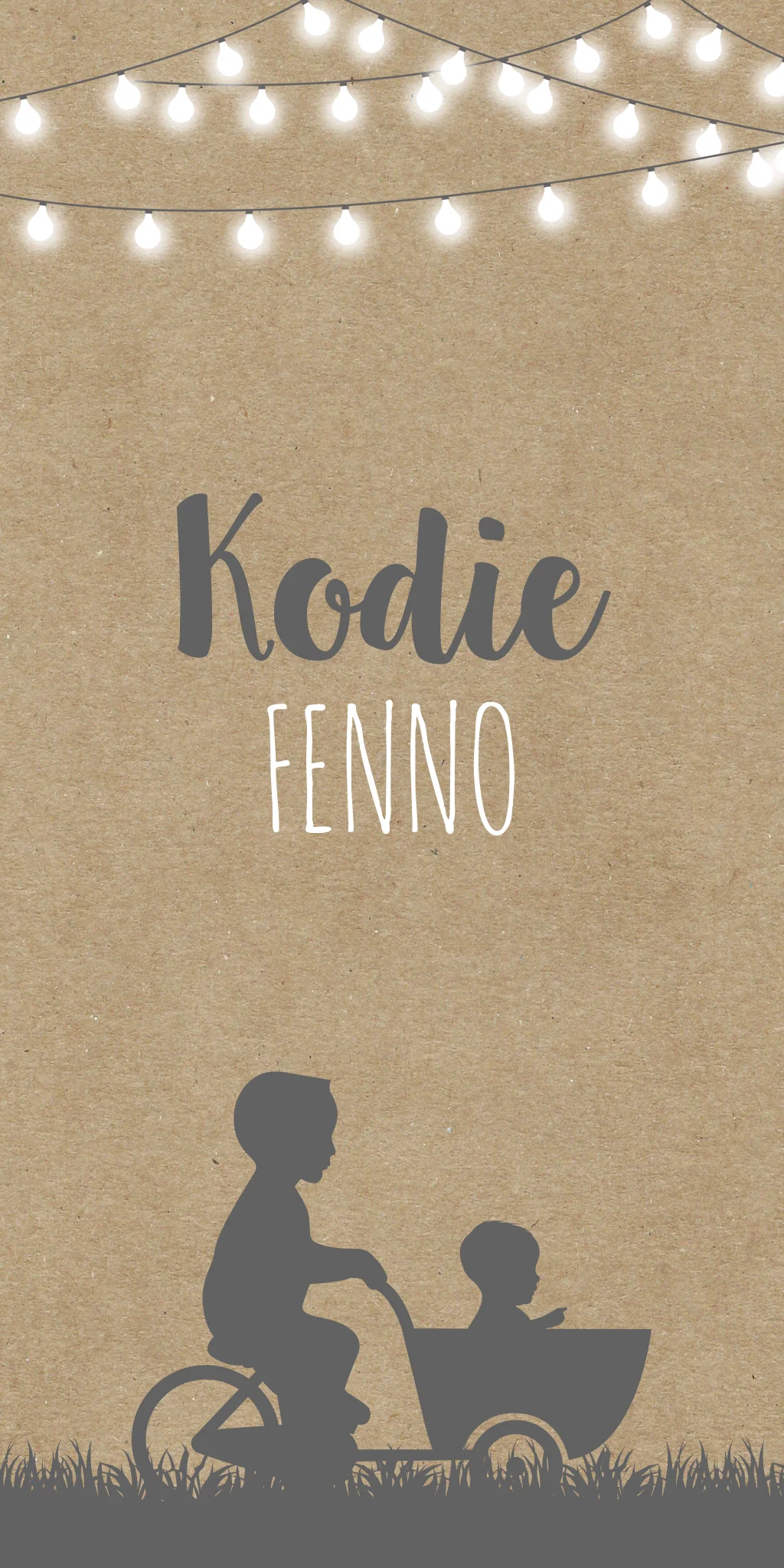 Een stoer geboortekaartje met een kraft-achtergrond. Op kaartje Kodie staan twee broertjes die aan het fietsen zijn met de bakfiets. Bovenaan de kaart zie je een lampjesslinger. Wil je het vrolijke kaartje graag aanpassen? Neem dan een kijkje in onze editor voor alle opties.