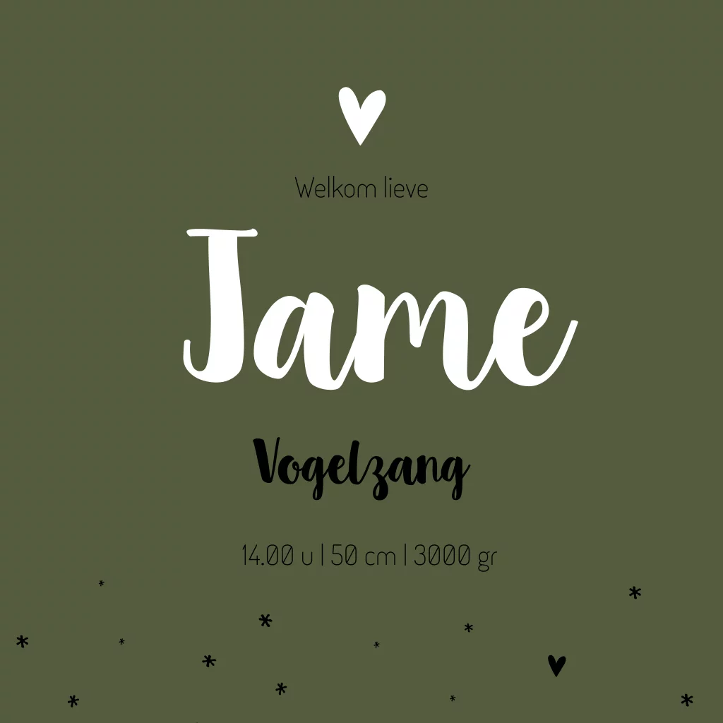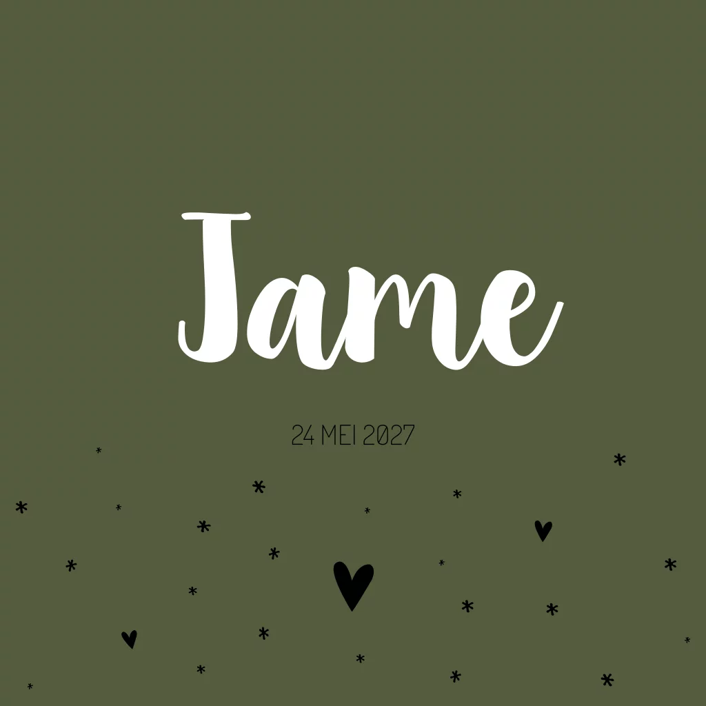 Legergroen stoer geboortekaartje met witte naam en zwarte hartjes en sterretjes. Verander de kleur en/of opmaak van geboortekaartje Jame eenvoudig in onze editor.
