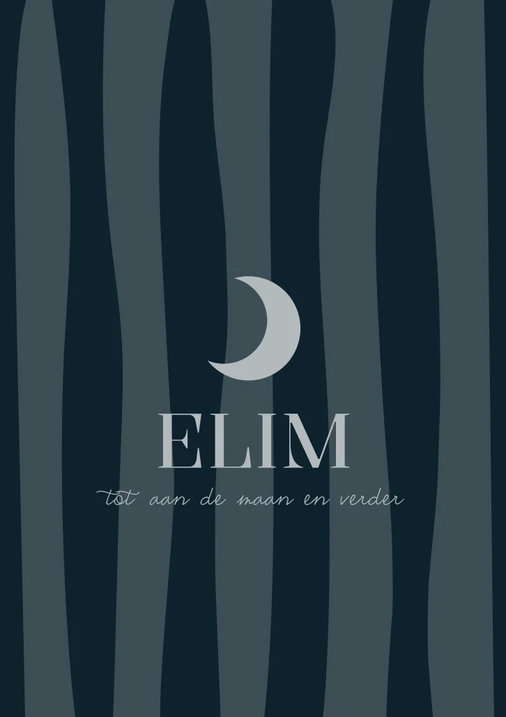 Een prachtig donkerblauw/grijsblauw kleurig gestreept baby kaartje Elim met een maantje.