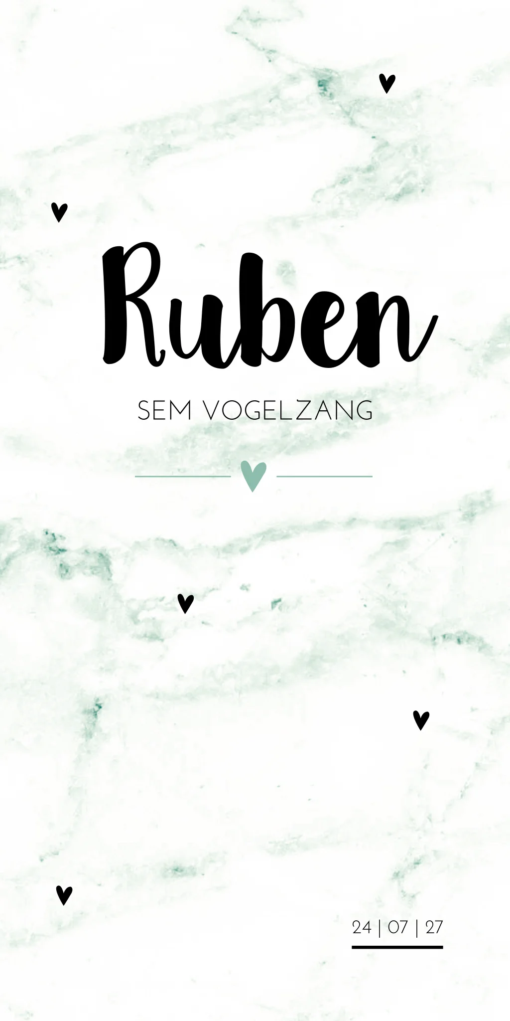 Geboortekaartje met een groene marmeren achtergrond en lieve hartjes. Pas kaartje Ruben gemakkelijk naar eigens wens aan in de editor.