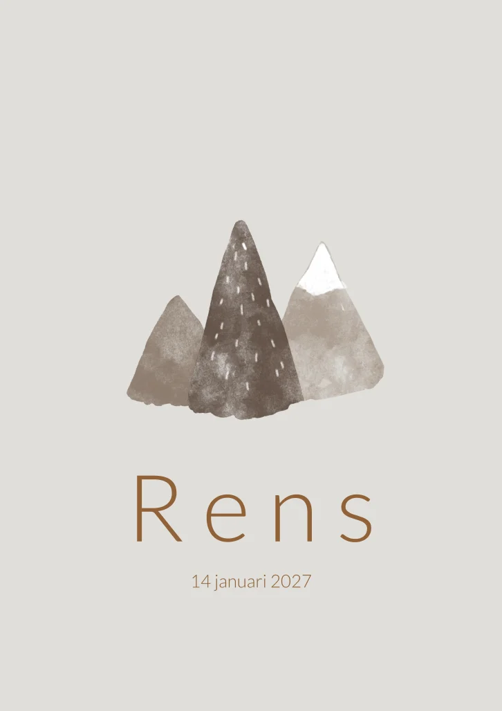 Een lichtgrijs geboortekaartje met een waterverf illustratie van drie bergen. Kaartje Rens is neutraal in kleur en opmaak waardoor het een tijdloos ontwerp is.