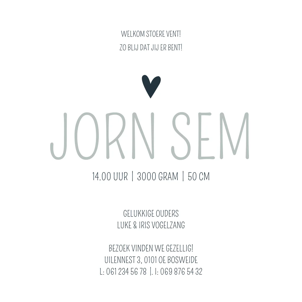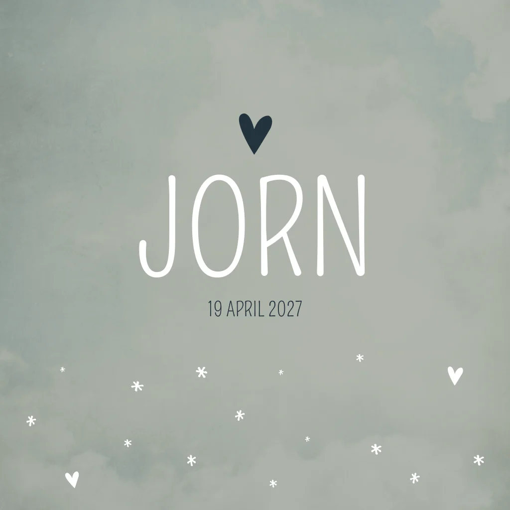 Early dew grijs groen gewolkt geboortekaartje met witte hartjes en sterretjes. Pas geboortekaartje Jorn naar eigen wens aan in de editor.