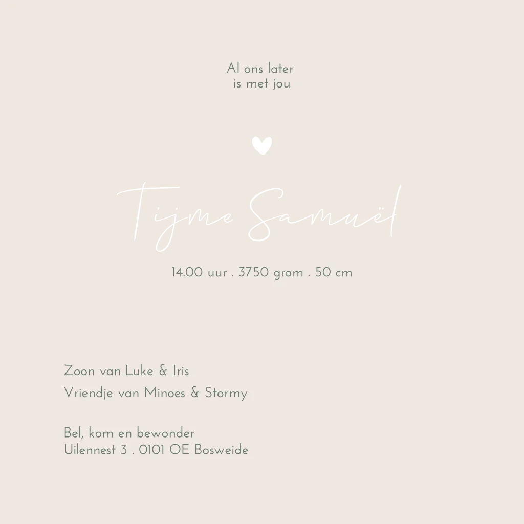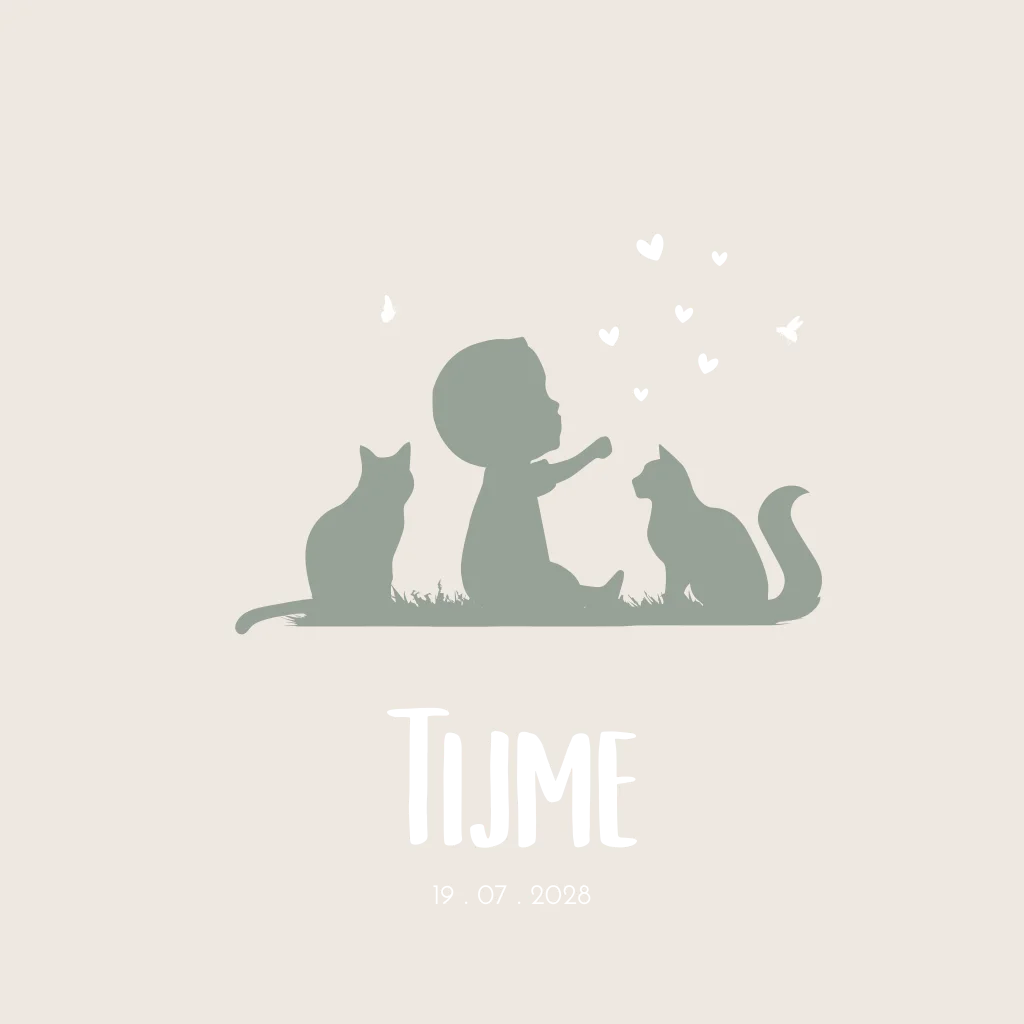 Een zacht en lief beige/ crème babykaartje Tijme met een illustratie tekening van 2 katten/ poezen en een jongetje in het midden. De poesjes zijn zijn vriendjes. Om hem heen vliegt een bij en een vlindertje. Pas de illustraties aan naar jouw wensen of gezinssituatie.