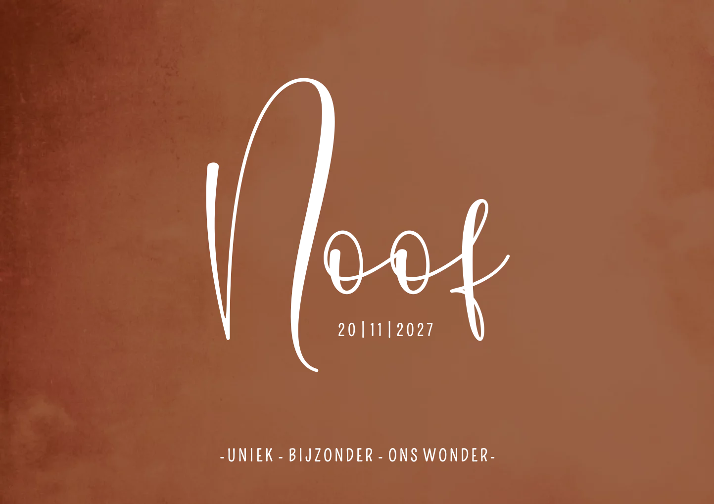 Chique roest bruin gewolkt geboortekaartje Noof met sierlijke letters voor de naam die je in goudfolie kunt laten drukken. Wil je liever een andere kleur achtergrond wat beter bij de babykamer past? Of een ander lettertype, je ontwerpt deze kaart helemaal zelf in de editor!