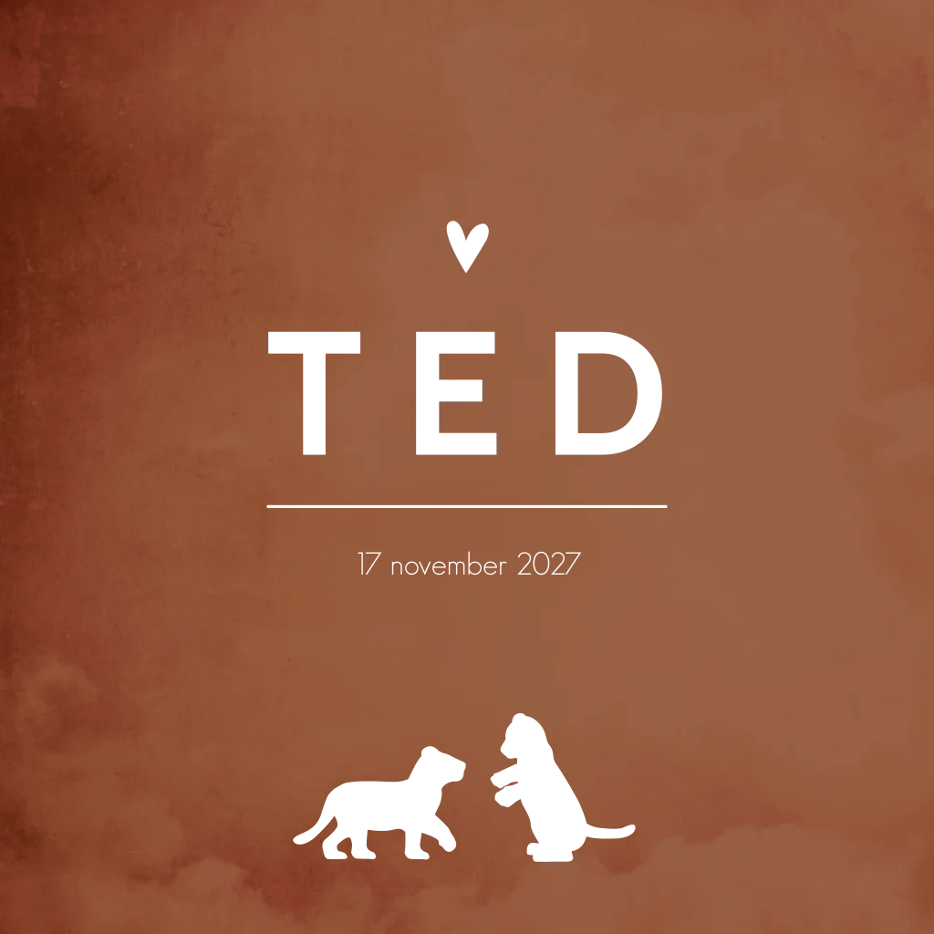 Roestbruin geboortekaartje Ted met gouden leeuwtjes en hartjes in Savanne kleuren. Dit kaartje is zeer geschikt voor goudfoliedruk. Liever een ander dier op de voorkant? Je past geboortekaartje Ted eenvoudig zelf aan in de editor.