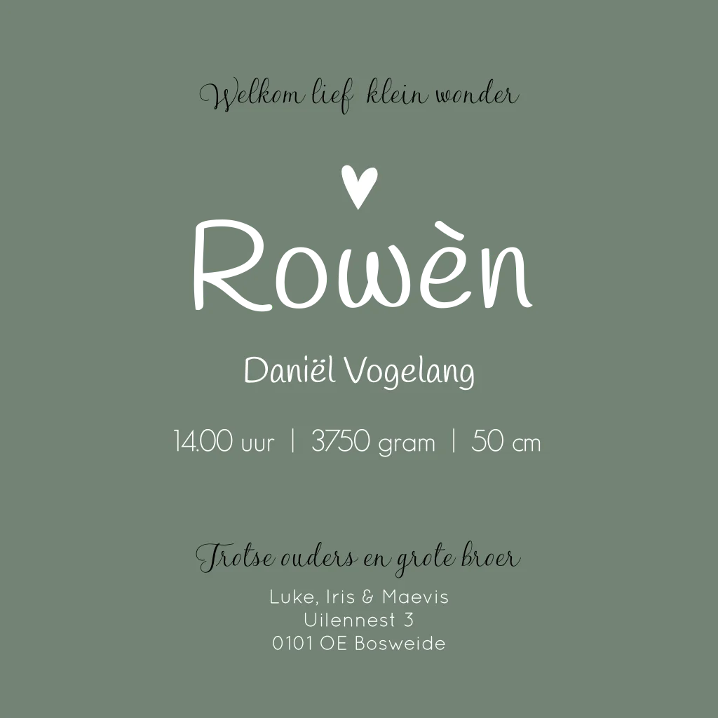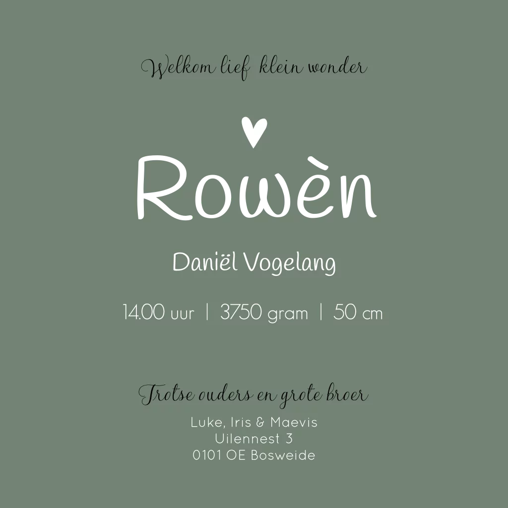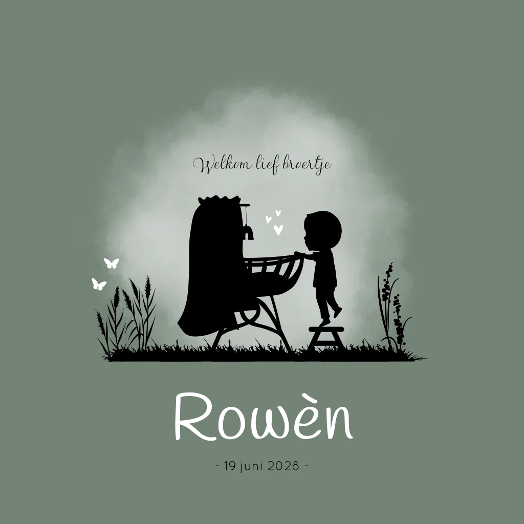 Een donkergroen met zwart geboortekaartje Rowèn met een silhouet illustratie van een wiegje in de natuur, met een grote broer die met zijn teentjes op een krukje staat om in de wieg te kijken waar zijn kleine babybroertje ligt. Er fladderen 2 vlinders om hen heen en er hangt een regenboogje boven het babybedje. Je past de illustraties, opmaak en kleuren helemaal zelf aan in onze online editor!