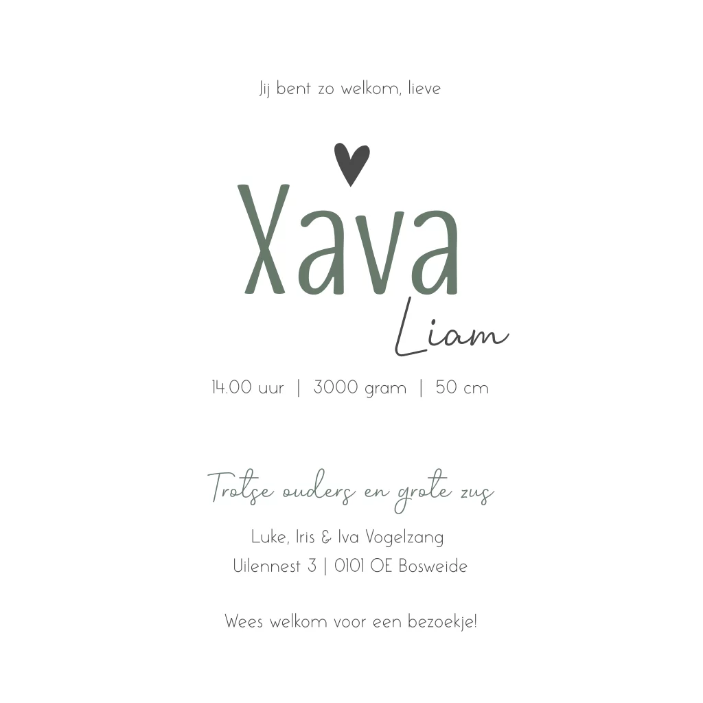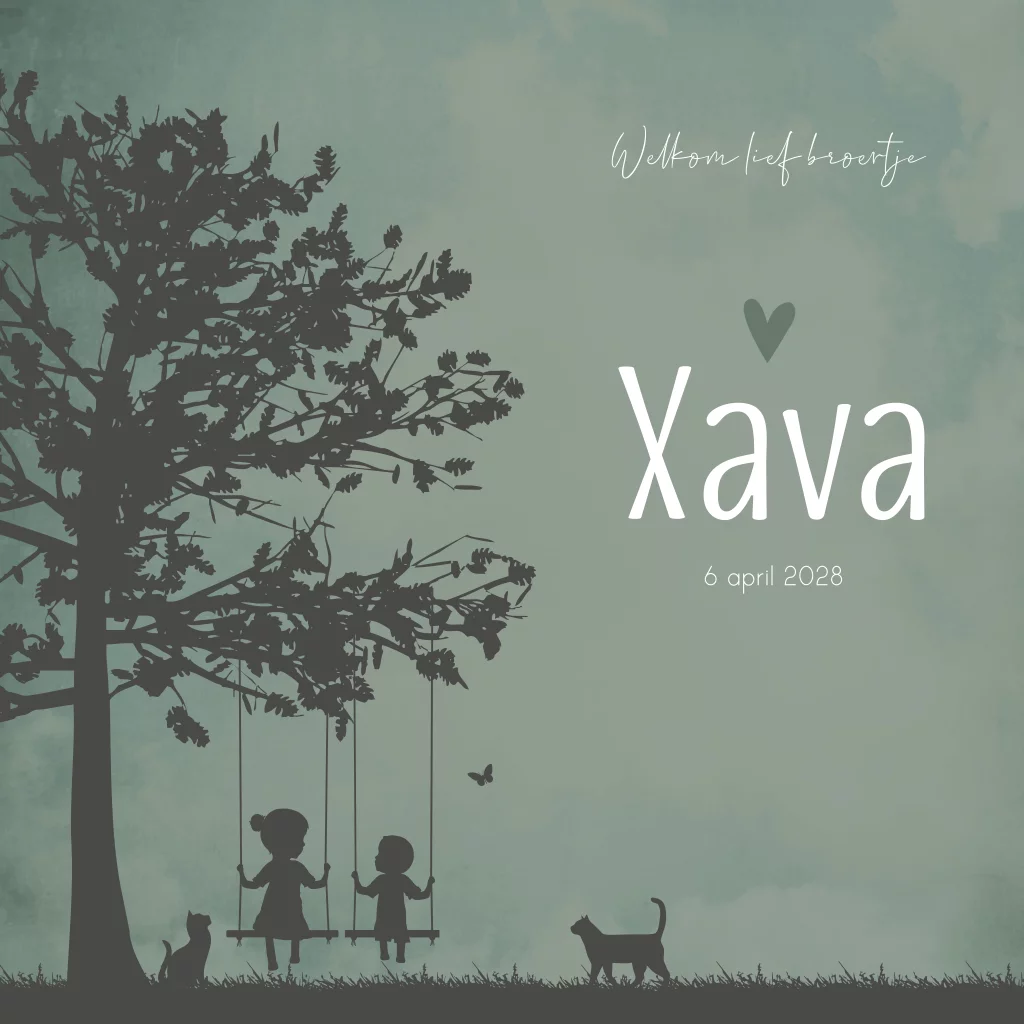 Een super leuk illustratief donkergroen geboortekaartje met een grote boom met 2 schommels, waar grote zus samen met haar kleine broertje aan het schommelen is. Een kat een een poes kijken naar de kindjes en een vlindertje dwarrelt rond in de tuin. Kaart Xava kun je volledig zelf aanpassen in onze online editor.