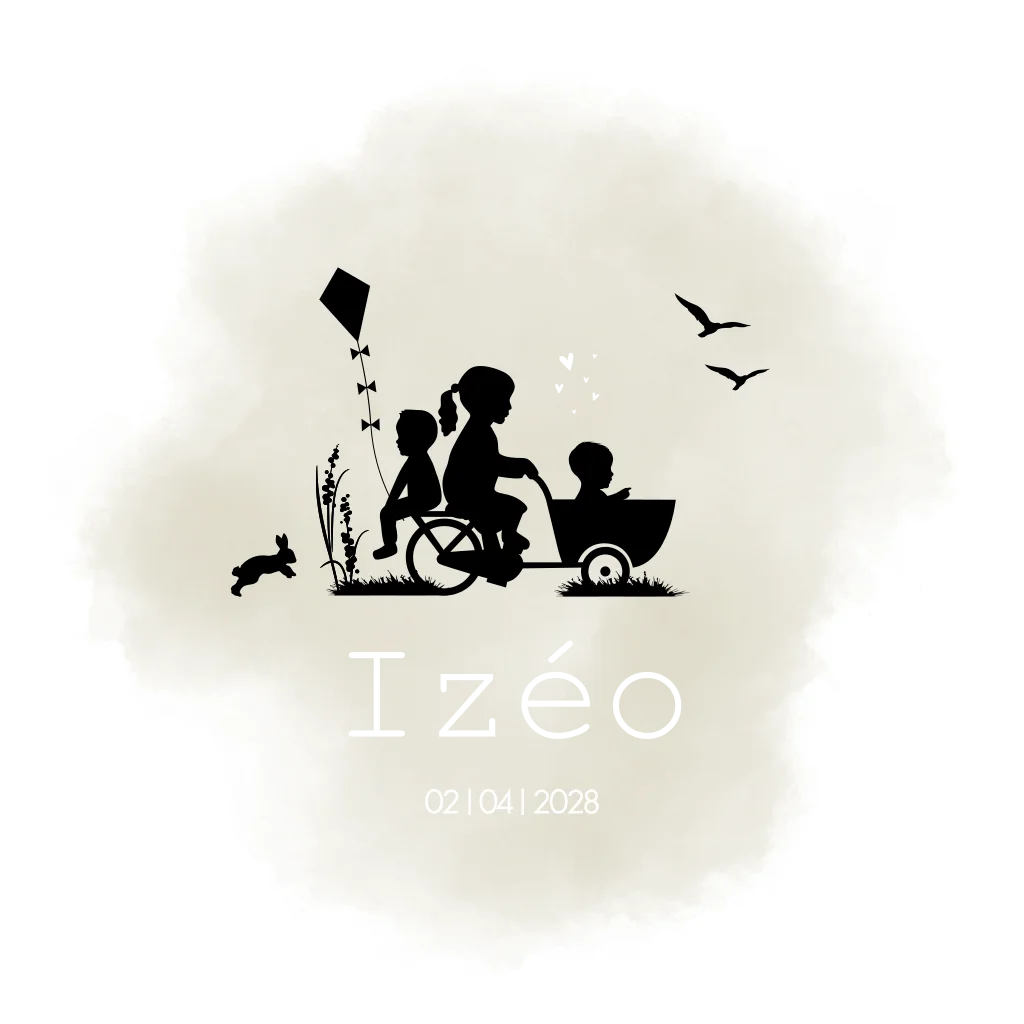Een dromerig wit geboortekaartje Izéo met een beige wolk, waar een grote zus op een bakfiets aan het fietsen is, met haar broertje achterop die een vlieger in zijn hand heeft. Voorin de bakfiets zit haar baby broertje. Achter de bakfiets hupt een konijntje mee en 2 vogels vliegen ook mee. De liefde spot er vanaf in de vorm van hartjes in goudfolie.