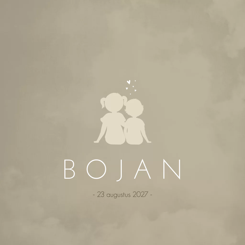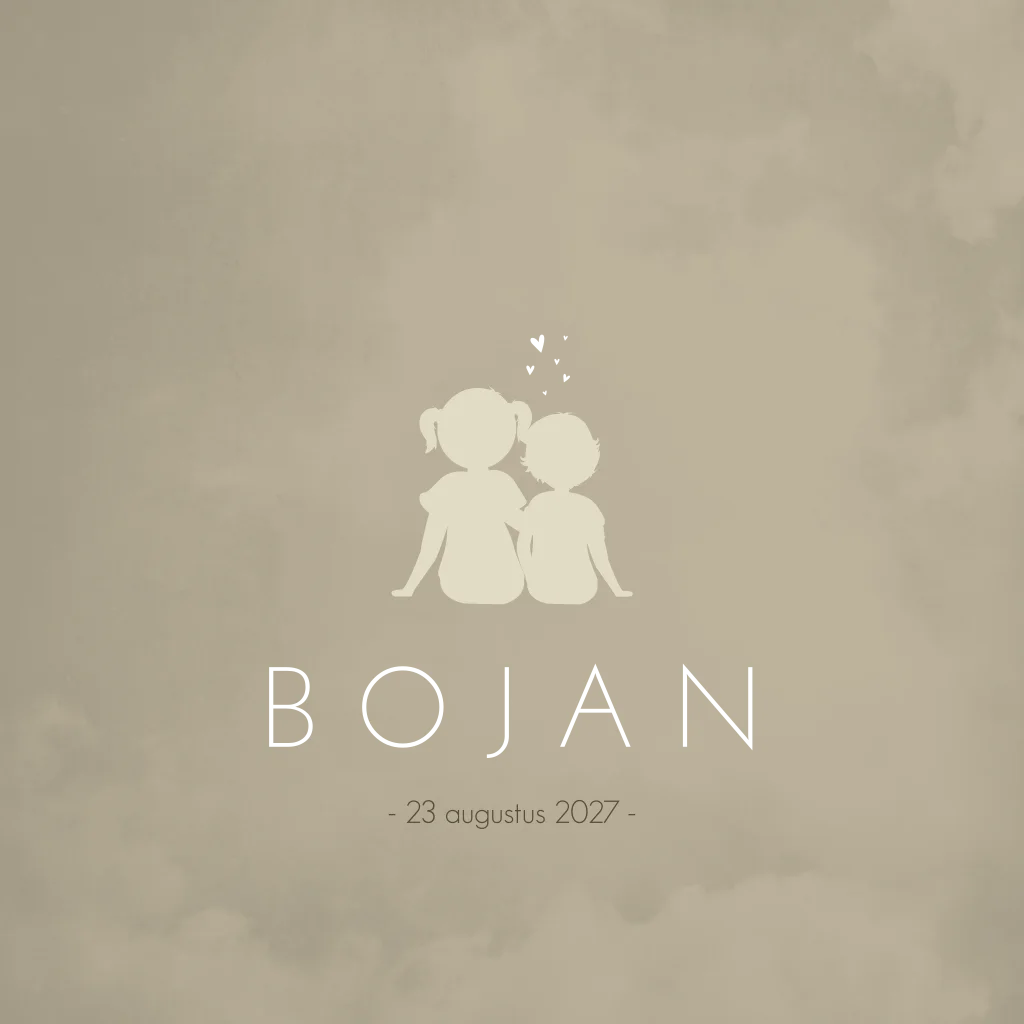 Romantisch en warm beige/ crème geboortekaartje Bojan met een silhouet tekening van een zus die naast haar kleine broertje zit en haar dingen over het leven vertelt en leert. Omdat ze zoveel van haar kleine broertje houdt vliegen de vonken in hartjes vorm er vanaf!