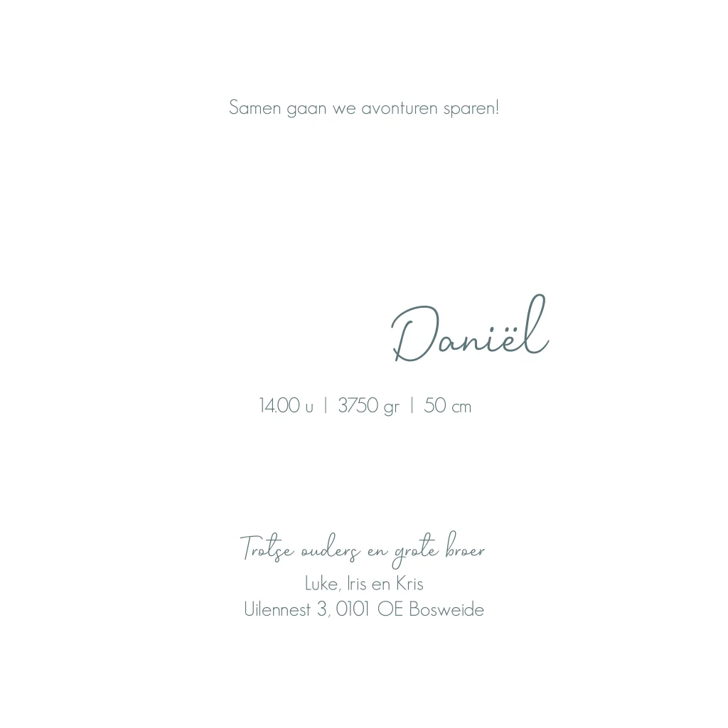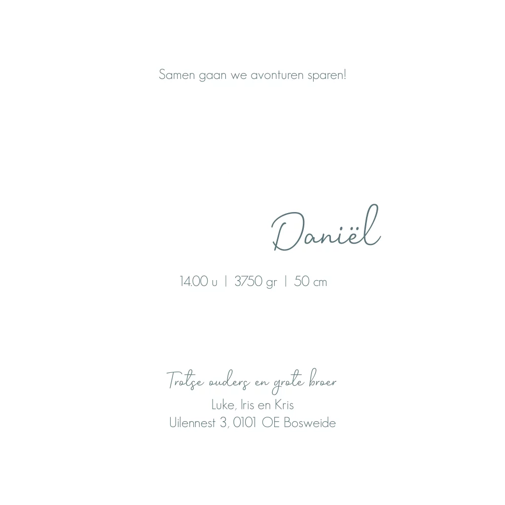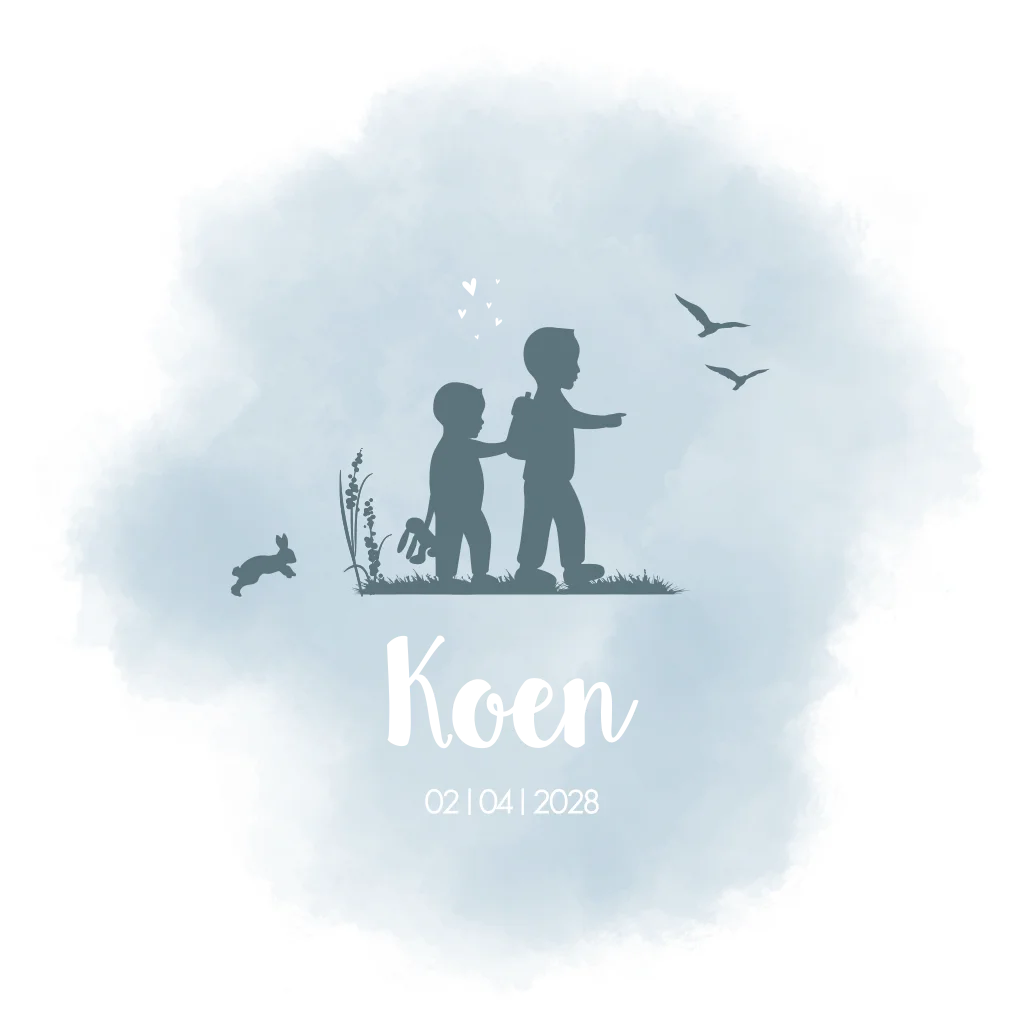 Een dromerig wit geboortekaartje Koen met een blauwe wolk van waterverf, waar je 2 broertjes hand in hand op ontdekkingstocht ziet gaan. Ze gaan samen wandelen en de wereld ontdekken. Een konijntje hupst mee in het gras en vogels vliegen ook mee. De liefde spot er vanaf in de vorm van hartjes in goudfolie.